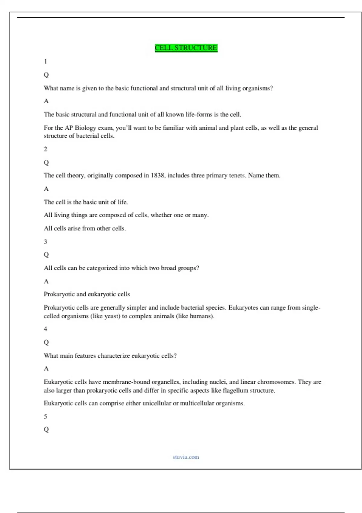 1 Q What name is given to the basic functional and structural unit of all living organisms? A The basic structural and functional unit of all known life-forms is the cell. For the AP Biology exam, you’ll want to be familiar with animal and plant cells, as well as the general structure of bacterial cells. 2 Q The cell theory, originally composed in 1838, includes three primary tenets. Name them. A The cell is the basic unit of life. All living things are composed of cells, whether one or many. All cells arise from other cells.