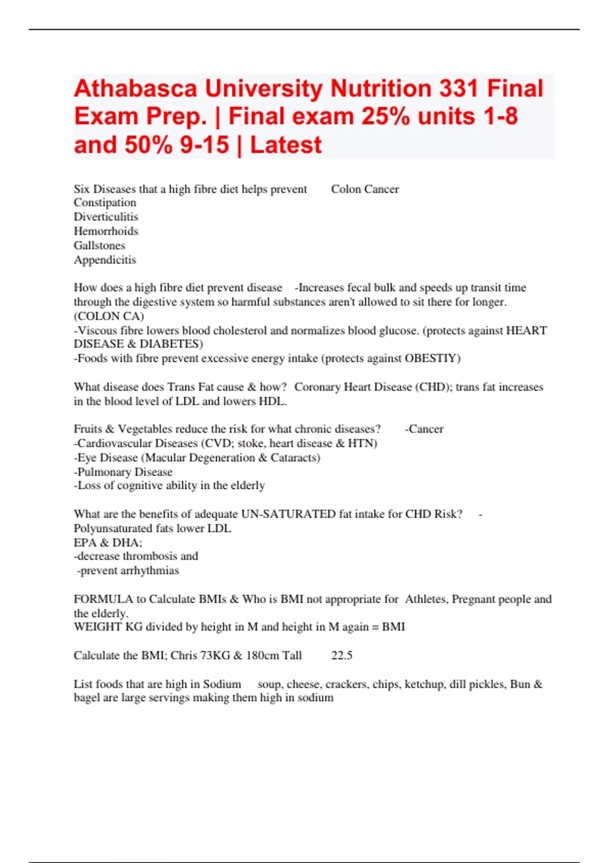 Athabasca University Nutrition 331 Final Exam Prep. | Final exam 25% units 1-8 and 50% 9-15 | Latest