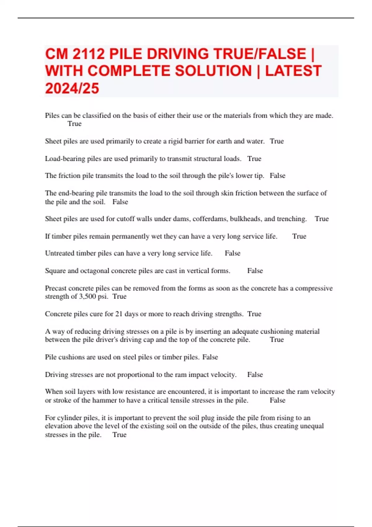 CM 2112 PILE DRIVING TRUE/FALSE | WITH COMPLETE SOLUTION | LATEST 2024/25