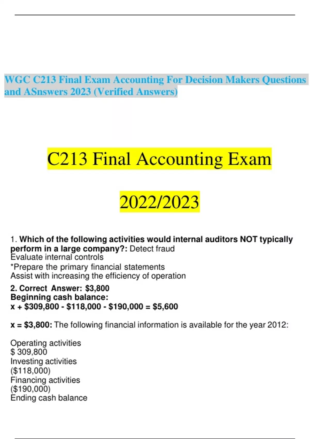 WGC C213 Final Exam Accounting For Decision Makers Questions and ASnswers 2023 (Verified Answers) C213 Final Accounting Exam 2022/2023 1. Which of the following activities would internal auditors NOT typically perform in a large company?: Detect fraud Evaluate internal controls *Prepare the primary financial statements Assist with increasing the efficiency of operation 2. Correct Answer: $3,800 Beginning cash balance: x + $309,800 - $118,000 - $190,000 = $5,600 x = $3,800: The following financial information is available for the year 2012: Operating activities $ 309,800 Investing activities ($118,000) Financing activities ($190,000) Ending cash balance $ 5,600 Given this information, what is the beginning cash balance? 3. Net Income: What is typically viewed as the fundamental measure of a company's profitability, but there are also a variety of other measures of "income." The best measure of sustainable profitability is income from continuing operations. 4. What are the three primary categories of an Income Statement?: The primary categories of income statement items are revenues, expenses, gains, and losses. 5. Income from continuing operations and extraordinary items: Income statement items that do not relate to a company's continuing operations are income from what? 6. Multi-step Income Statement: When revenue and expense items are arranged to highlight important profit relationships, the resulting income statement format is called a? 7. The Matching Concept: Revenue should be recognized when value has been delivered to customers which is typically only after the required work has been performed and after the collection of cash is reasonably assured. What method is used to decide when to recognize expenses? 8. Assets = Liabilities + Paid-in Capital + (Revenues - Expenses - Dividends)- : Individual transactions impacting income can be analyzed using the expanded accounting equation, which is: 9. Forecast income for future periods.: What is an important use of an income statement? It requires an understanding of what underlying factors determine the level of a revenue or an expense. 10. Accrual Accounting: What is the process that accountants use in adjusting raw transaction data into refined measures of a firm's economic performance? 11. Financial Capital Maintenance: A concept that states that income exists when the dollar amount of a company's net assets (assets - liabilities, or owners' equity) increases during the year, after excluding the effects of new owner investment or payment of dividends to owners. What is this approach called? 12. Gross Profit: What equals sales revenues minus the cost of goods sold. This is the money you take in from selling goods and how much those good cost you to make. 13. Net Profit: What is equal to gross profit minus fixed costs. Start with gross profit and subtract fixed costs (rent, salaries, taxes, utilities, fees, amortization, depreciation 14. Gross profit is an important number. If a company is not generating enough from the sale of a product or service to cover the costs directly associated with that product or service, that company will not be able to stay in that line of business for long.: Why is Gross Profit an important number? 15. Operating Income: What measures the performance of the fundamental business operations conducted by a company and is computed as gross profit minus operating expenses? 16. Operating income tells users how well a business is performing in the activities unique to that business, separate from the financing and income tax management policies that are handled at the corporate headquarters level.: What does Operating Income tell a business? 17. Provides interested parties with information that can be used to predict how a company will perform in the future.: What is a key purpose of financialaccounting? 18. Income from Continuing Operations: What is a desired income number that reflects the aspects of a company's performance that is expected to continue into the future