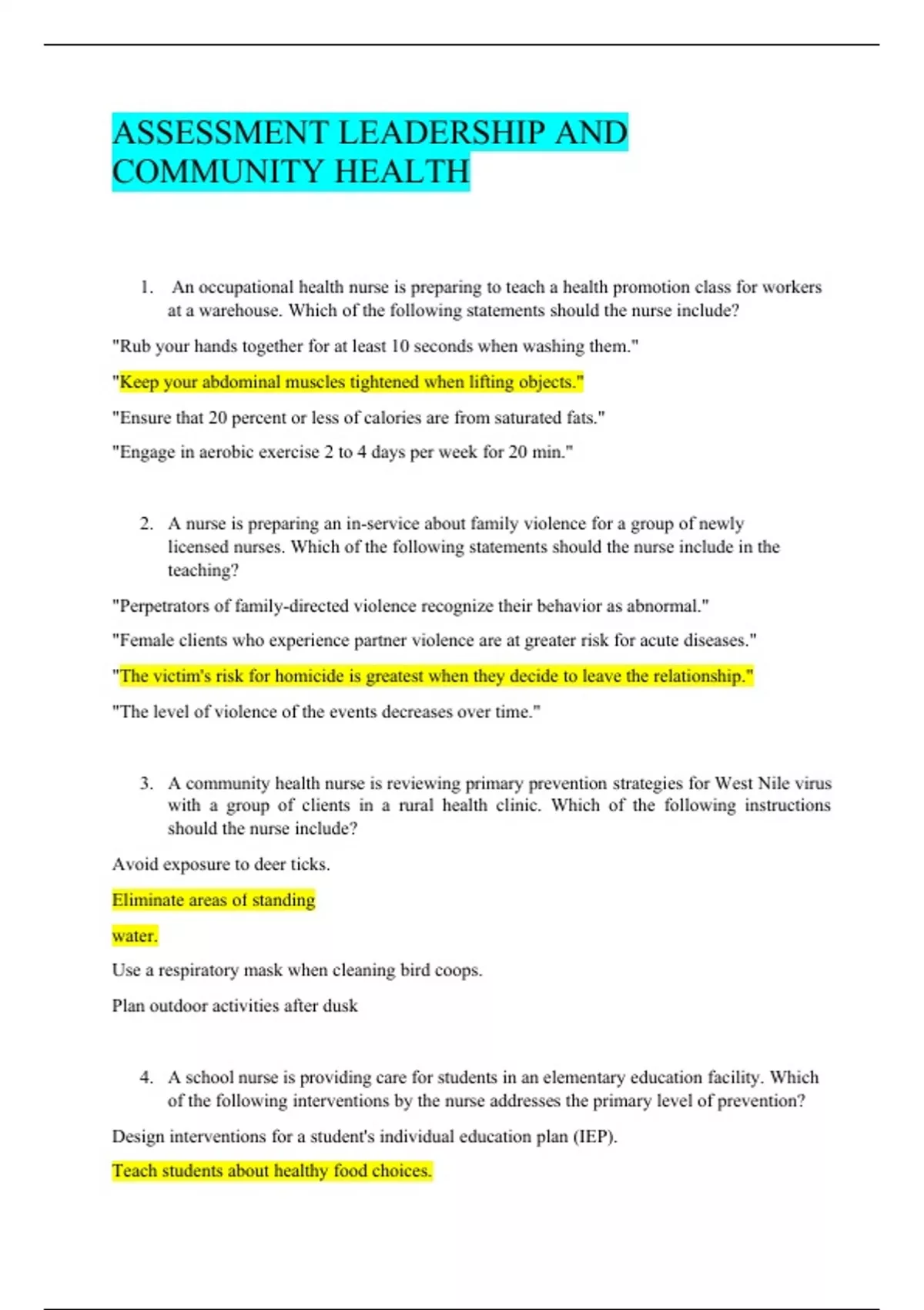 ASSESSMENT LEADERSHIP AND COMMUNITY HEALTH 1. An occupational health nurse is preparing to teach a health promotion class for workers at a warehouse. Which of the following statements should the nurse include? "Rub your hands together for at least 10 seconds when washing them." "Keep your abdominal muscles tightened when lifting objects." "Ensure that 20 percent or less of calories are from saturated fats." "Engage in aerobic exercise 2 to 4 days per week for 20 min." 2. A nurse is preparing an in-service about family violence for a group of newly licensed nurses. Which of the following statements should the nurse include in the teaching? "Perpetrators of family-directed violence recognize their behavior as abnormal." "Female clients who experience partner violence are at greater risk for acute diseases." "The victim's risk for homicide is greatest when they decide to leave the relationship." "The level of violence of the events decreases over time." 3. A community health nurse is reviewing primary prevention strategies for West Nile virus with a group of clients in a rural health clinic. Which of the following instructions should the nurse include? Avoid exposure to deer ticks. Eliminate areas of standing water. Use a respiratory mask when cleaning bird coops. Plan outdoor activities after dusk 4. A school nurse is providing care for students in an elementary education facility. Which of the following interventions by the nurse addresses the primary level of prevention? Design interventions for a student's individual education plan (IEP). Teach students about healthy food choices. Perform first aid for minor injuries. Perform scoliosis screenings for students. 5. A nurse is conducting a home visit with an older adult client. Which of the following observations should the nurse address to promote a safe environment? Loud volume of the television set Wall-to-wall carpet in the living room Low chairs without armrests Use of indirect lighting 6. A case manager completes a history and physical assessment for a client who has COPD. Which of the following actions should the case manager take next? Identify the client's current health needs. Call the provider with a list of client concerns. Compile a list of community resources for the client. Refer the client to a COPD support group 7. A nurse manager is implementing a quality improvement project to reduce the number of methicillinresistant Staphylococcus aureus (MRSA) infections at the facility. Which of the following actions should the nurse manager take first? Develop a MRSA protocol for implementation. Provide educational in-service for staff. Evaluate outcomes resulting from interventions. Conduct a chart review to evaluate precipitating factors of clients who develop MRSA. 8. A nurse manager is teaching a group of employees about standards for Quality and Safety Education for Nurses (QSEN). Which of the following statements by an employee should the nurse manager identify as an example of the QSEN concept of quality improvement? "We should start tracking how soon clients are discharged after laparoscopic versus open surgery." "We should be sure to log out of the computers immediately following documentation." "We should involve our clients' partners in care planning as much as possible." "We should provide change-of-shift report as a team, including the assistive personnel who assisted with care. 9. A hospice nurse is providing teaching to a client who has a new diagnosis of a terminal illness and her family. Which of the following statements should the nurse include in the teaching? "Hospice care focuses on disease treatment and rehabilitation." "The provider will coordinate your health care needs while in hospice." "You must choose a family caregiver before being admitted into a hospice facility." "Hospice care continues to help families with grief after a death occurs." 10. A nurse manager is discussing electronic medical records with a newly licensed nurse. Which of the following actions should the nurse take to maintain client confidentiality? (Select all that apply.) Log out of the computer terminal before leaving. Share passwords for computer access with colleagues. Change computer access passwords on a regular basis. Avoid accessing information about clients admitted to other units. Shred computer-generated client worksheets after use. 11. A nurse is completing an assessment of a recently widowed older adult client. He states he is unable to drive and is afraid to cook on the stove. Which of the following community resources should the nurse recommend? Hospice care Meals on Wheels Home health services American Association of Retired Persons 12. A charge nurse is discussing HIPAA with a newly licensed nurse. Which of the following actions should the charge nurse include in the teaching as an example of a HIPAA violation? Posting the name of the nurse providing care on a client's communication board Discussing the client's new medication with a hospital pharmacist Faxing requested medical information for a client who is transferring to another facility Emailing the client's positive hepatitis results from an unencrypted serve 13. A nurse manager is preparing to complete staff performance appraisals. Which of the following principles should the nurse manager consider when completing the appraisals? Performance appraisals should be written in measurable terms. Appraisal objectives should be applicable to staff at every level. Performance appraisals should be based on the nurse manager's preferences. Completed appraisals should be approved by a provider. 14. A nurse is caring for a client and realizes they have administered the wrong medication. Which of the following actions should the nurse take first? Notify the provider. Check the condition of the client. Document the occurrence in the electronic medical record. Complete an incident report. 15. A nurse is caring for a newborn in the nursery following a circumcision. The newborn's 