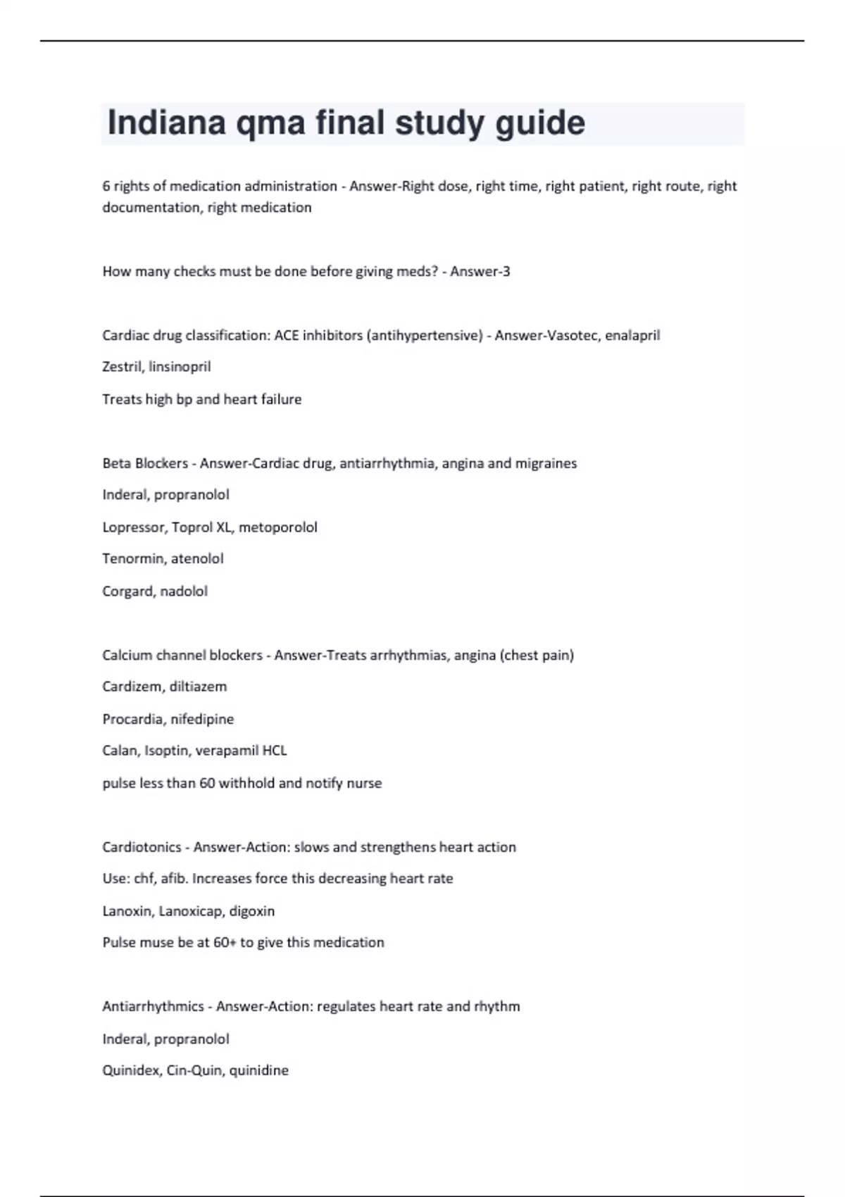 6 rights of medication administration - Answer-Right dose, right time, right patient, right route, right documentation, right medication How many checks must be done before giving meds? - Answer-3 Cardiac drug classification: ACE inhibitors (antihypertensive) - Answer-Vasotec, enalapril Zestril, linsinopril Treats high bp and heart failure Beta Blockers - Answer-Cardiac drug, antiarrhythmia, angina and migraines Inderal, propranolol Lopressor, Toprol XL, metoporolol Tenormin, atenolol Corgard, nadolol Calcium channel blockers - Answer-Treats arrhythmias, angina (chest pain) Cardizem, diltiazem Procardia, nifedipine Calan, Isoptin, verapamil HCL pulse less than 60 withhold and notify nurse Cardiotonics - Answer-Action: slows and strengthens heart action Use: chf, afib. Increases force this decreasing heart rate Lanoxin, Lanoxicap, digoxin Pulse muse be at 60+ to give this medication Antiarrhythmics - Answer-Action: regulates heart rate and rhythm Inderal, propranolol Quinidex, Cin-Quin, quinidinePronestyl, procainamide HCL Cordarone, Pacerone, aminodarone Norpace Rythmol Antihypertensives - Answer-Aldomet, methyldopa Catapres, clonidine HCL Minipress, prazosin