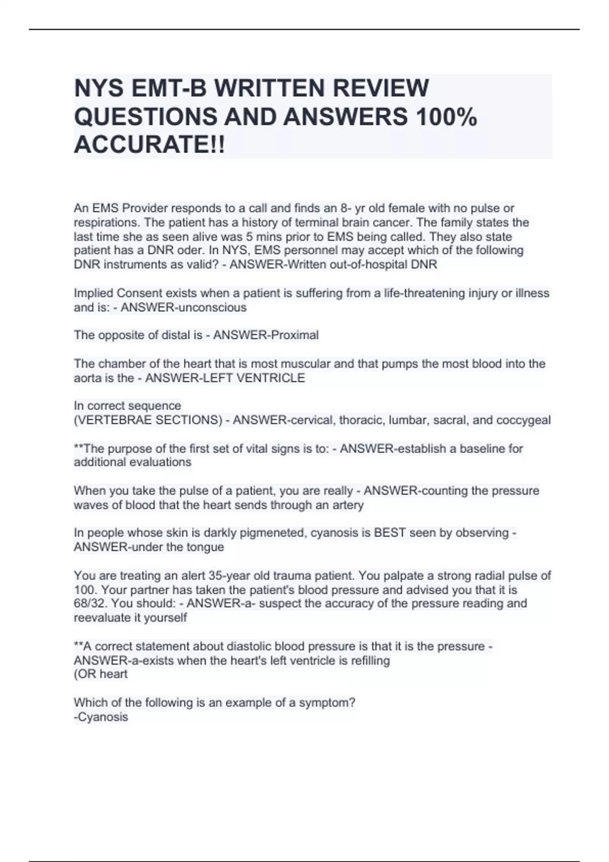 An EMS Provider responds to a call and finds an 8- yr old female with no pulse or respirations. The patient has a history of terminal brain cancer. The family states the last time she as seen alive was 5 mins prior to EMS being called. They also state patient has a DNR oder. In NYS, EMS personnel may accept which of the following DNR instruments as valid? - ANSWER-Written out-of-hospital DNR Implied Consent exists when a patient is suffering from a life-threatening injury or illness and is: - ANSWER-unconscious The opposite of distal is - ANSWER-Proximal The chamber of the heart that is most muscular and that pumps the most blood into the aorta is the - ANSWER-LEFT VENTRICLE In correct sequence (VERTEBRAE SECTIONS) - ANSWER-cervical, thoracic, lumbar, sacral, and coccygeal **The purpose of the first set of vital signs is to: - ANSWER-establish a baseline for additional evaluations When you take the pulse of a patient, you are really - ANSWER-counting the pressure waves of blood that the heart sends through an artery In people whose skin is darkly pigmeneted, cyanosis is BEST seen by observing - ANSWER-under the tongue You are treating an alert 35-year old trauma patient. You palpate a strong radial pulse of 100. Your partner has taken the patient's blood pressure and advised you that it is 68/32. You should: - ANSWER-a- suspect the accuracy of the pressure reading and reevaluate it yourself **A correct statement about diastolic blood pressure is that it is the pressure - ANSWER-a-exists when the heart's left ventricle is refilling (OR heart Which of the following is an example of a symptom? -Cyanosis -Chest pain -Dilated pupils -Low BP - ANSWER-CHEST PAIN For a patient with a suspected lumbar spinal injury, the BEST device for moving the patient as a single unit over uneven terrain is the: -wheeled stretcher -long spine board -flexible stretcher -short spine board - ANSWER-*fleixble stretcher? Which of the following is the best indicator of the quality of ventilations -chest expansion -pupil size -blood pressure -skin color - ANSWER-CHEST EXPANSION Unless additional suctioning time is necessary to clear the airway, an adult patient should be suctioned for N