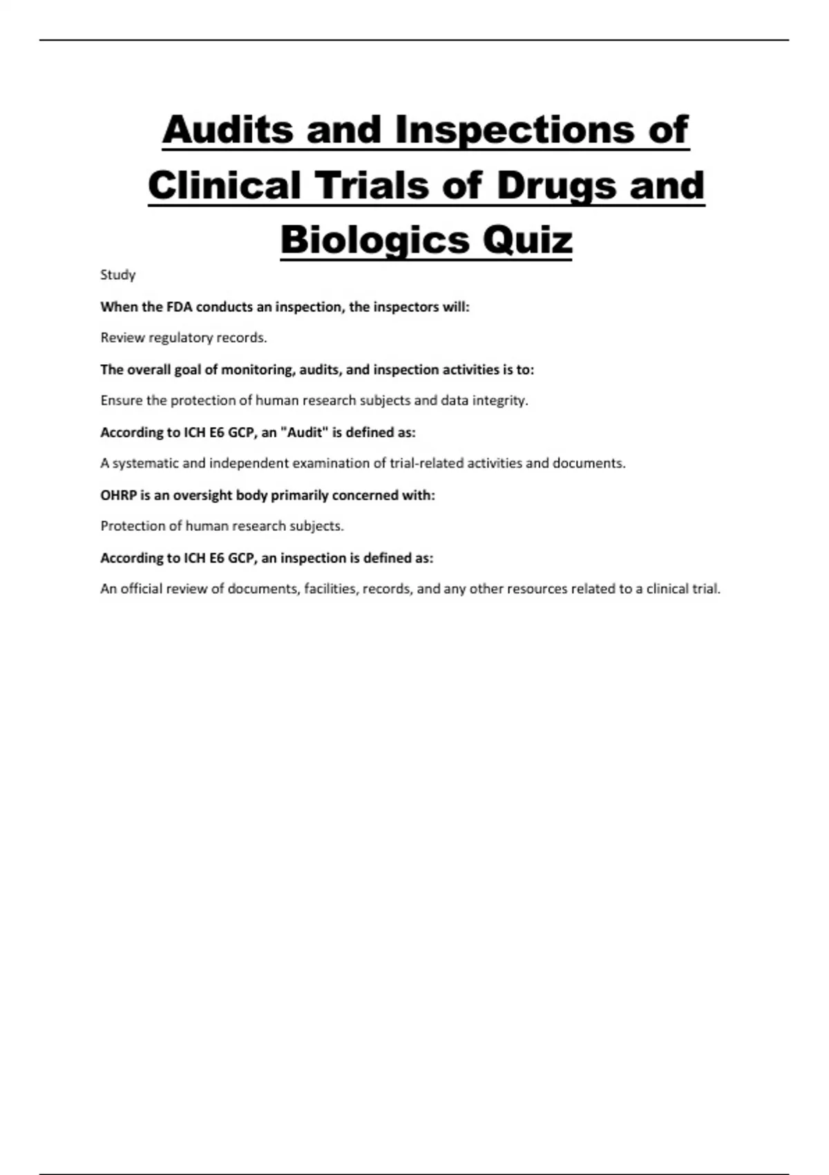 Audits and Inspections of Clinical Trials of Drugs and Biologics Quiz Complete with Answers Verified and Graded