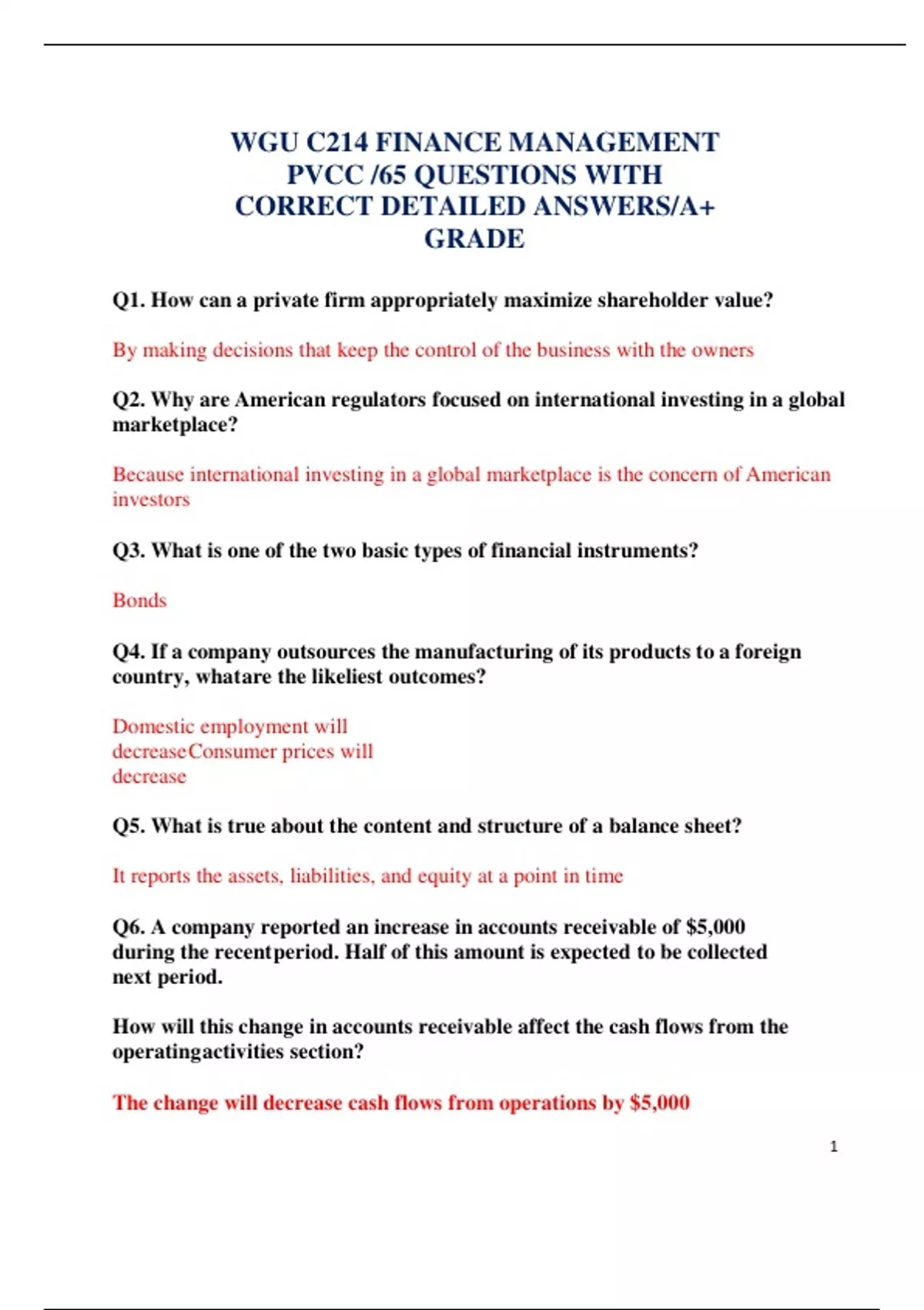 WGU C214 FINANCE MANAGEMENT PVCC /65 QUESTIONS WITH CORRECT DETAILED ANSWERS/A+ GRADE Q1. How can a private firm appropriately maximize shareholder value? By making decisions that keep the control of the business with the owners Q2. Why are American regulators focused on international investing in a global marketplace? Because international investing in a global marketplace is the concern of American investors Q3. What is one of the two basic types of financial instruments? Bonds Q4. If a company outsources the manufacturing of its products to a foreign country, what are the likeliest outcomes? Domestic employment will decrease Consumer prices will decrease Q5. What is true about the content and structure of a balance sheet? It reports the assets, liabilities, and equity at a point in time
