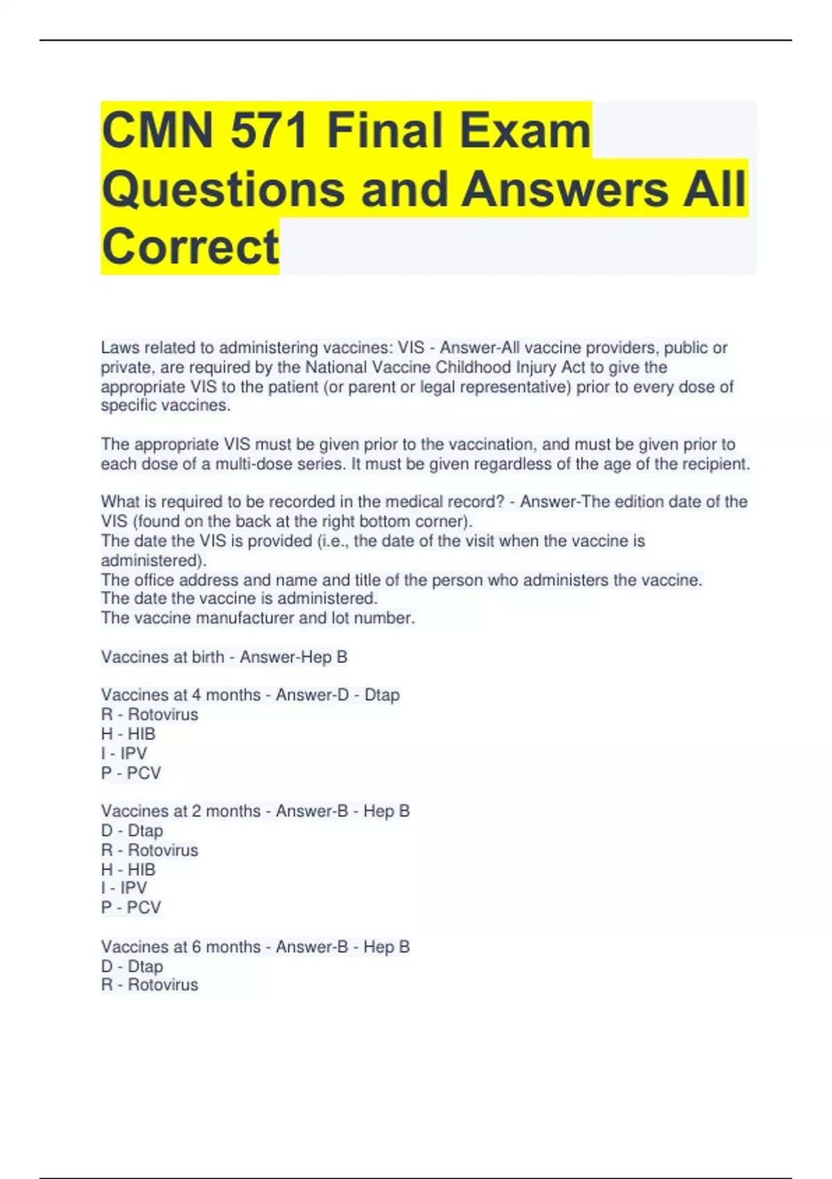 CMN 571 Practice Test Questions with Correct Answers When should Heb B not be given? - Answer-Serious allergic reaction to yeast or any vaccine component (previous reaction to hep B) How is rotavirus spread? - Answer-fecal-oral transmission, contact with contaminated surfaces, eating contaminated foods Side effect of rotavirus vaccine? (RV5, RV1) - Answer-intussusception Maximum initial dose age for rotavirus? - Answer-14 weeks and 6 days (no safety data on older infant administration) When should you not give rotavirus vaccine? RSV1 specifically? - Answer-previous serious allergic reaction of infant w history of intussception of any cause Infant with severe combined immunodeficiency (SCID) infant with acute moderate or severe gastroenteritis RSV1 specifically with latex allergies Adverse effects of rotavirus? - Answer-vomiting and diarrhea cough and runny nose When should DTaP not be given? - Answer-child w previous reaction, who has developed encephalopathy within 7 days of previous dose individual w progressive neurologic disorder (infant spasm, uncontrolled epilepsy, progressive encephalopathy) until their nauro status is clarified and stabilized Precautions to DTaP vaccine? - Answer-High fever (40.5), persistent inconsolable crying, or shock like state within 48 hours of prev dose, seizures within 3 days of prev dose, Guillain-Barre syndrome within 6 weeks of prev dose, or incident moderate or severe acute illness with or without fever Pneumococcal vaccine should be deferred when? - Answer-during a moderate or severe acute illness with or without fever Adverse effects of Pneumococcal vaccine - Answer-small risk of febrile seizure if administered with inactivated influenza vaccine IPV vaccine - Answer-Poliomyelitis vaccine Contraindications to adminsitering IPV vaccine? - Answer-moderate or severe acute illness with or without fever pregnancy Can you give IPV vaccine during pregnancy? - Answer-Do with precaution MMR Vaccine can cause what reaction? - Answer-Febrile seizures MMR Vaccine should not be given to who? - Answer-Pregnant women What age does a child crawl? - Answer-6-8 months What age does child run? - Answer-18 months What age should the child be able to walk backwards? - Answer-30 months (2.5 years) What age should be using pronouns? - Answer-24 months When should child be holding crayon with fist? - Answer-30 months (2.5 years)