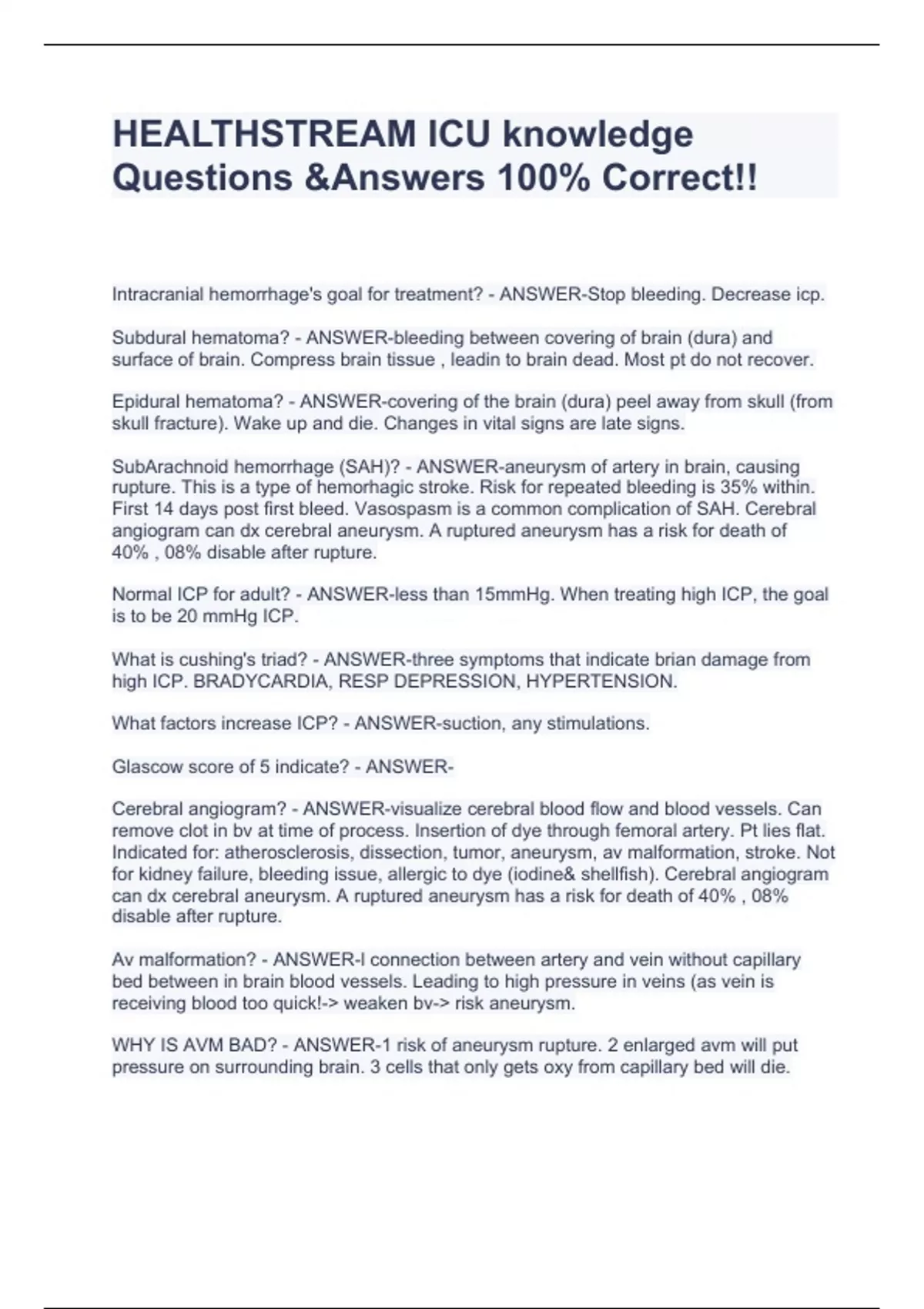 Intracranial hemorrhage's goal for treatment? - ANSWER-Stop bleeding. Decrease icp. Subdural hematoma? - ANSWER-bleeding between covering of brain (dura) and surface of brain. Compress brain tissue , leadin to brain dead. Most pt do not recover. Epidural hematoma? - ANSWER-covering of the brain (dura) peel away from skull (from skull fracture). Wake up and die. Changes in vital signs are late signs. SubArachnoid hemorrhage (SAH)? - ANSWER-aneurysm of artery in brain, causing rupture. This is a type of hemorhagic stroke. Risk for repeated bleeding is 35% within. First 14 days post first bleed. Vasospasm is a common complication of SAH. Cerebral angiogram can dx cerebral aneurysm. A ruptured aneurysm has a risk for death of 40% , 08% disable after rupture. Normal ICP for adult? - ANSWER-less than 15mmHg. When treating high ICP, the goal is to be 20 mmHg ICP. What is cushing's triad? - ANSWER-three symptoms that indicate brian damage from high ICP. BRADYCARDIA, RESP DEPRESSION, HYPERTENSION. What factors increase ICP? - ANSWER-suction, any stimulations. Glascow score of 5 indicate? - ANSWER- Cerebral angiogram? - ANSWER-visualize cerebral blood flow and blood vessels. Can remove clot in bv at time of process. Insertion of dye through femoral artery. Pt lies flat. Indicated for: atherosclerosis, dissection, tumor, aneurysm, av malformation, stroke. Not for kidney failure, bleeding issue, allergic to dye (iodine& shellfish). Cerebral angiogram can dx cerebral aneurysm. A ruptured aneurysm has a risk for death of 40% , 08% disable after rupture. Av malformation? - ANSWER-l connection between artery and vein without capillary bed between in brain blood vessels. Leading to high pressure in veins (as vein is receiving blood too quick!-> weaken bv-> risk aneurysm. WHY IS AVM BAD? - ANSWER-1 risk of aneurysm rupture. 2 enlarged avm will put pressure on surrounding brain. 3 cells that only gets oxy from capillary bed will die. Types of AV MALFORMATION? - ANSWER-dural fistula, venous malformation, cavernoma, capillary telangiectasia. two locations of AVM? - ANSWER-BRAIN & SPINE. treatment for avm? - ANSWER-embolization - deliver glue/ obstructive materials into avm, thus, blood cant flow into avm to cause rupture. what test is used to locate what part of the brain is damaged by seizure or stroke. this test combines both neuroimaging anf neuropsychological tests? - ANSWER-wada test- inject barbiturate into carotid artery to shut down one brian hemisphere and evaluate the opposite hemisphere.. How to know if a person will be allergic to angiogram dye? - ANSWER-allergic to iodine and shellfish. A pt with cerebral aneurysm is dx. What can the medical team do to secure it in preventing rupture of the aneurysm? - ANSWER-clipping , endovascular coiling. What is the procedure of opening the skull? - ANSWER-craniotomy. What is clipping? - ANSWER-clip at the neck of aneurysm to block normal blood floe from entering; thus, stop it from stretching further and eventually rupture. What is endovascular coiling? - ANSWER-fill aneurysm with spiral coil to stop blood from filling the aneurysm; thus, prevent high blood pressure from rupturing. Post coiling : extremity straight, neuro check, watch for stroke. Carotid stenting? - ANSWER-place a stent to keep carotid artery open. Complications: increase risk for stroke by 10%. , Mi 5%, bleeding, formation of clots in stent. What cause vasospasm post cerebral stenting? - ANSWER-breakdown of hemoglobin in the subarachnoid space, cre