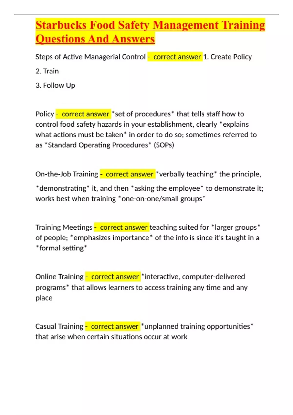 Starbucks Food Safety Management Training Questions And Answers