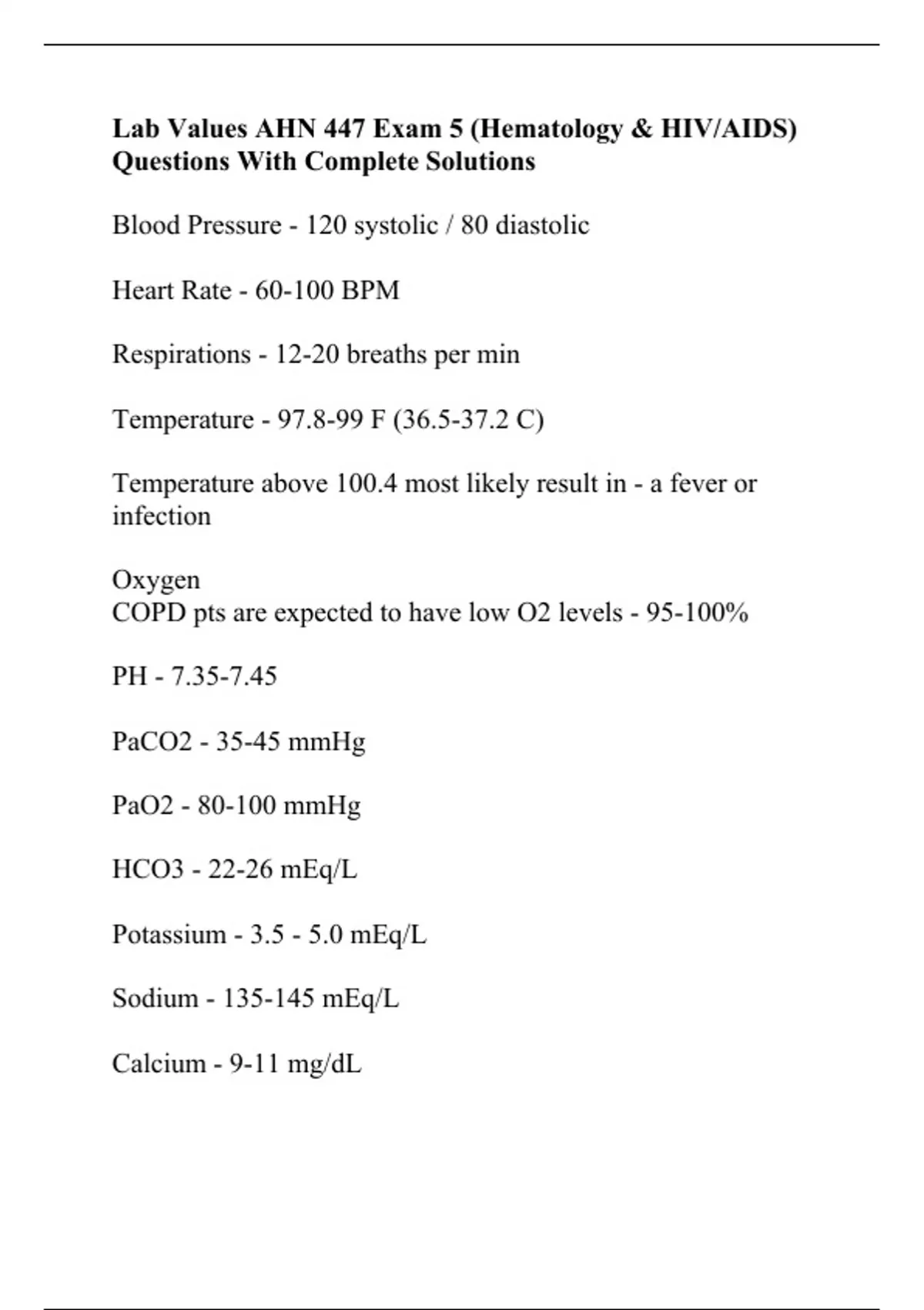 Lab Values AHN 447 Exam 5 (Hematology & HIV/AIDS) Questions With Complete Solutions