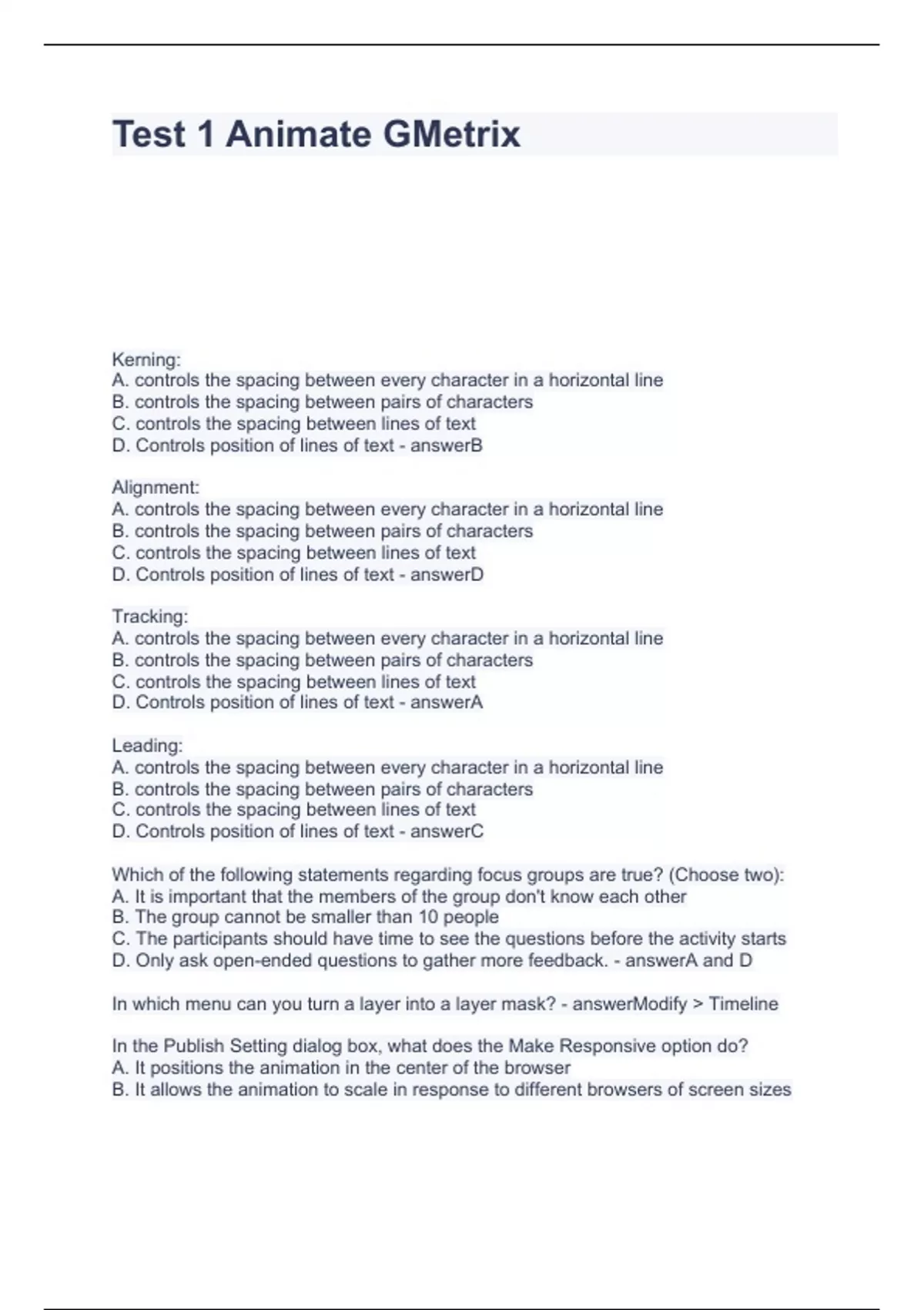 Test 1 Animate GMetrix questions with best solutions
