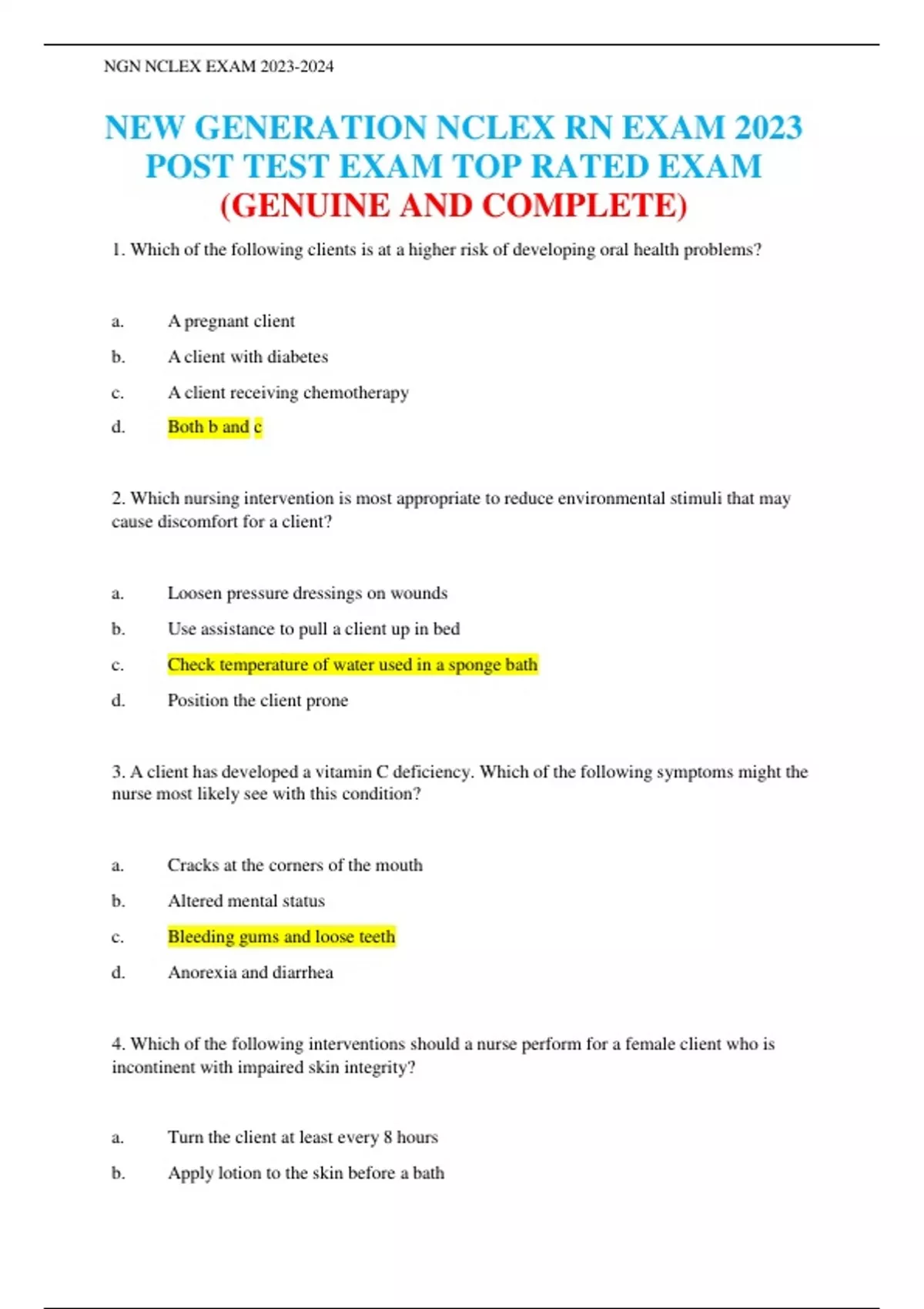 NEW GENERATION NCLEX RN EXAM 2023 POST TEST EXAM TOP RATED EXAM (GENUINE AND COMPLETE) 1. Which of the following clients is at a higher risk of developing oral health problems? a. A pregnant client b. A client with diabetes c. A client receiving chemotherapy d. Both b and c 2. Which nursing intervention is most appropriate to reduce environmental stimuli that may cause discomfort for a client? a. Loosen pressure dressings on wounds b. Use assistance to pull a client up in bed c. Check temperature of water used in a sponge bath d. Position the client prone 3. A client has developed a vitamin C deficiency. Which of the following symptoms might the nurse most likely see with this condition? a. Cracks at the corners of the mouth b. Altered mental status c. Bleeding gums and loose teeth d. Anorexia and diarrhea 4. Which of the following interventions should a nurse perform for a female client who is incontinent with impaired skin integrity? a. Turn the client at least every 8 hours b. Apply lotion to the skin before a bath NGN NCLEX EXAM c. Provide perineal care after the client uses the bathroom d. Bathe the client every 3 days 5. A nurse is caring for a client who died approximately one hour ago. The nurse notes that the client's temperature has decreased in the last hour since his death. Which of the following processes explains this phenomenon? a. Rigor mortis b. Postmortem decomposition c. Algor mortis d. Livor mortis 6. A nurse is calculating a client's intake and output. During the last shift, the client has had ½ cup of gelatin, a skinless chicken breast, 1 cup of green beans, and 300 cc of water. The client has urinated 250 cc and has had 2 bowel movements. What is this client's intake and output for this shift? a. 420 cc intake, 250 cc output b. 300 cc intake, 250 cc output c. 550 cc intake, 550 cc output d. 300 cc intake, 550 cc output 7. A nurse is caring for a client with ariboflavinosis. Which of the following foods should the nurse serve this client? a. Citrus fruits b. Milk c. Fish d. Potatoes NGN NCLEX EXAM 8. A client is taking a walk down the hallway when she suddenly realizes that she needs to use the restroom. Although she tries to make it to the bathroom on time, she is incontinent of urine before reaching the toilet. What type of incontinence does this situation represent? a. Reflex incontinence b. Urge incontinence c. Total incontinence d. Functional incontinence 9. Which of the following is an example of a positive effect of exercise on a client? a. Decreased basal metabolic rate b. Decreased veno