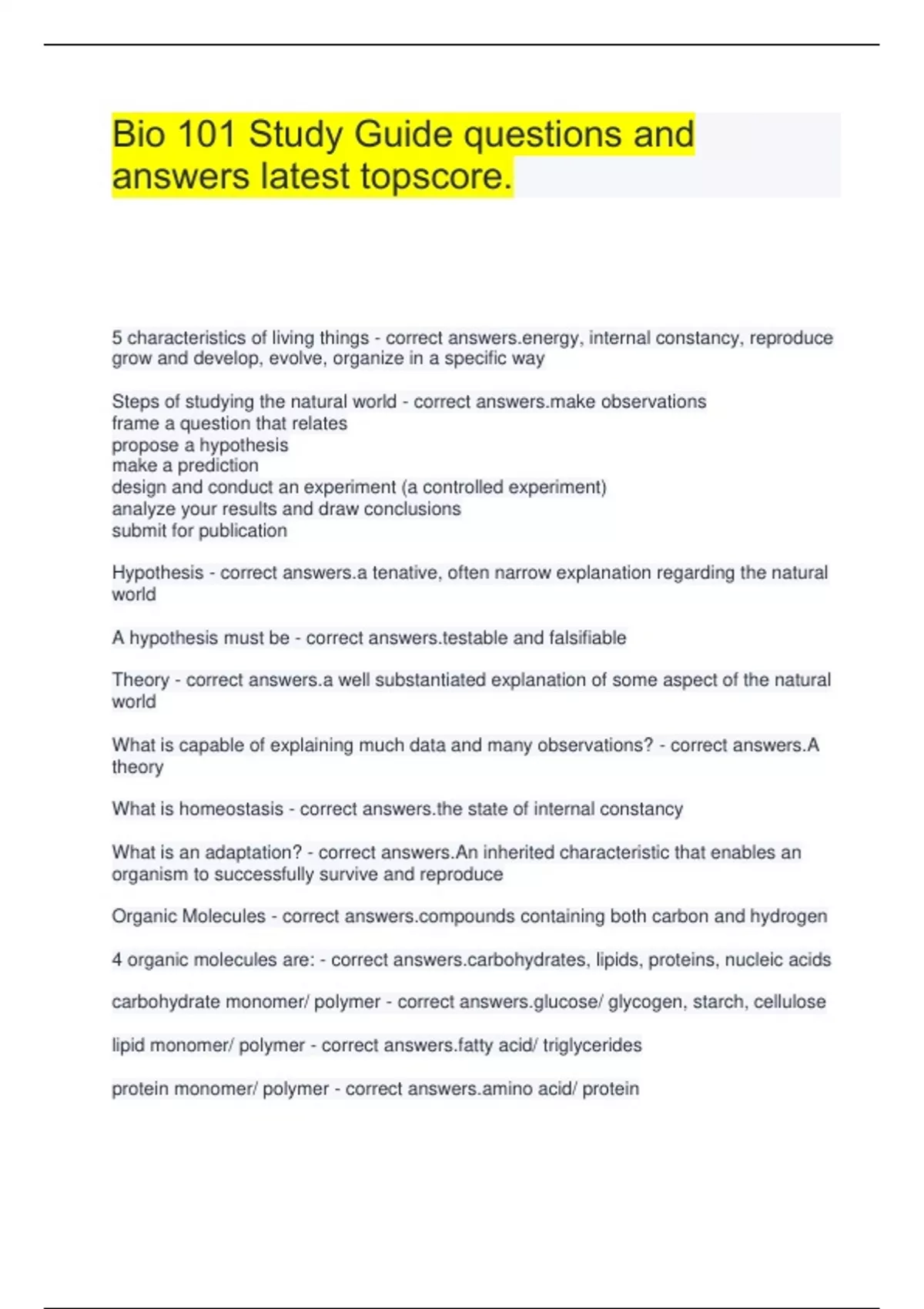 Bio 101 Study Guide questions and answers latest topscore. 5 characteristics of living things - correct y, internal constancy, reproduce grow and develop, evolve, organize in a specific way Steps of studying the natural world - correct observations frame a question that relates propose a hypothesis make a prediction design and conduct an experiment (a controlled experiment) analyze your results and draw conclusions submit for publication Hypothesis - correct answers.a tenative, often narrow explanation regarding the natural world A hypothesis must be - correct ble and falsifiable Theory - correct answers.a well substantiated explanation of some aspect of the natural world What is capable of explaining much data and many observations? - correct answers.A theory What is homeostasis - correct state of internal constancy What is an adaptation? - correct answers.An inherited characteristic that enables an organism to successfully survive and reproduce Organic Molecules - correct unds containing both carbon and hydrogen 4 organic molecules are: - correct hydrates, lipids, proteins, nucleic acids carbohydrate monomer/ polymer - correct se/ glycogen, starch, cellulose lipid monomer/ polymer - correct acid/ triglycerides protein monomer/ polymer - correct acid/ protein