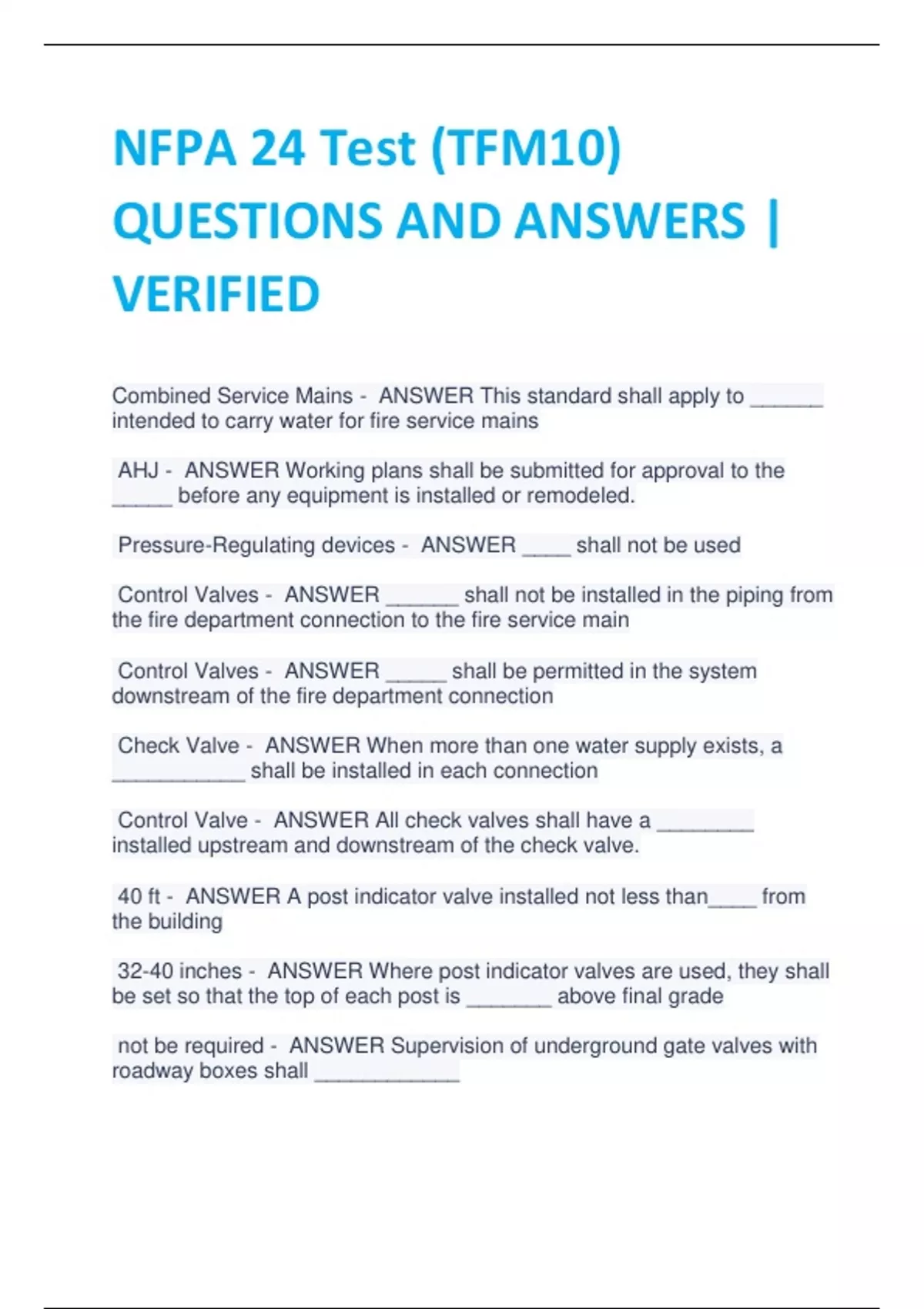 NFPA 24 Test (TFM10) QUESTIONS AND ANSWERS | VERIFIED Combined Service Mains - ANSWER This standard shall apply to ______ intended to carry water for fire service mains AHJ - ANSWER Working plans shall be submitted for approval to the _____ before any equipment is installed or remodeled. Pressure-Regulating devices - ANSWER ____ shall not be used Control Valves - ANSWER ______ shall not be installed in the piping from the fire department connection to the fire service main Control Valves - ANSWER _____ shall be permitted in the system downstream of the fire department connection Check Valve - ANSWER When more than one water supply exists, a ___________ shall be installed in each connection Control Valve - ANSWER All check valves shall have a ________ installed upstream and downstream of the check valve. 40 ft - ANSWER A post indicator valve installed not less than____ from the building 32-40 inches - ANSWER Where post indicator valves are used, they shall be set so that the top of each post is _______ above final grade not be required - ANSWER Supervision of underground gate valves with roadway boxes shall ____________ not be less than 6 inches - ANSWER The connection from the hydrant to the main shall ___________ not less than 40 ft - ANSWER Hydrants shall be located _________ from the buildings to be protected flat stones, concrete slabs, or other approved material - ANSWER Hydrants shall be installed on __________ less than 18 inches - ANSWER The center of a hose outlet shall not be ____________ above final grade more than 36 inches - ANSWER The center of a hose outlet shall not be _______ above final grade less than 150 psi - ANSWER All piping used in private fire service mains shall be rated for the maximum system working pressure to which the piping is exposed to but shall not be rated at _______________ asphalt or other corrosion-retarding material - ANSWER All bolted joint accessories shall be cleaned and thoroughly coated with _______________ after installation not be less than 30 inches - ANSWER In locations where freezing is not a factor, the depth of cover shall __________________ below grade to prevent mechanical damage. minimum depth of 36 inches - ANSWER Private fire service mains installed under driveways or roadways shall be buried at a ______________ run in a covered trench - ANSWER Where private fire mains extend more than 10 ft into the building, they shall be ___________ 1 part cement, 2 1/2 parts sand, and 5 parts stone - ANSWER Thrust blocks shall be concrete of a mix not leaner than ______________ not less than 5/8 in diameter - ANSWER Rods shall be _____________ shall be cleaned and thoroughly coated with a bituminous or other acceptable corrosion-retarding material - ANSWER After installation, rods, nuts, bolts, washers, clamps, and other restraining devices _____________________ restrained at the bottom of a hill and at any lateral or vertical turns - ANSWER Pipe shall be _____________________ facing uphill - ANSWER Bell ends shall be __________ clear of debris - ANSWER The flushing operation shall continue until water flow is verified to be ___________ completing and signing the contractors material and test certificates - ANSWER The installing contractor shall be responsible for __________________