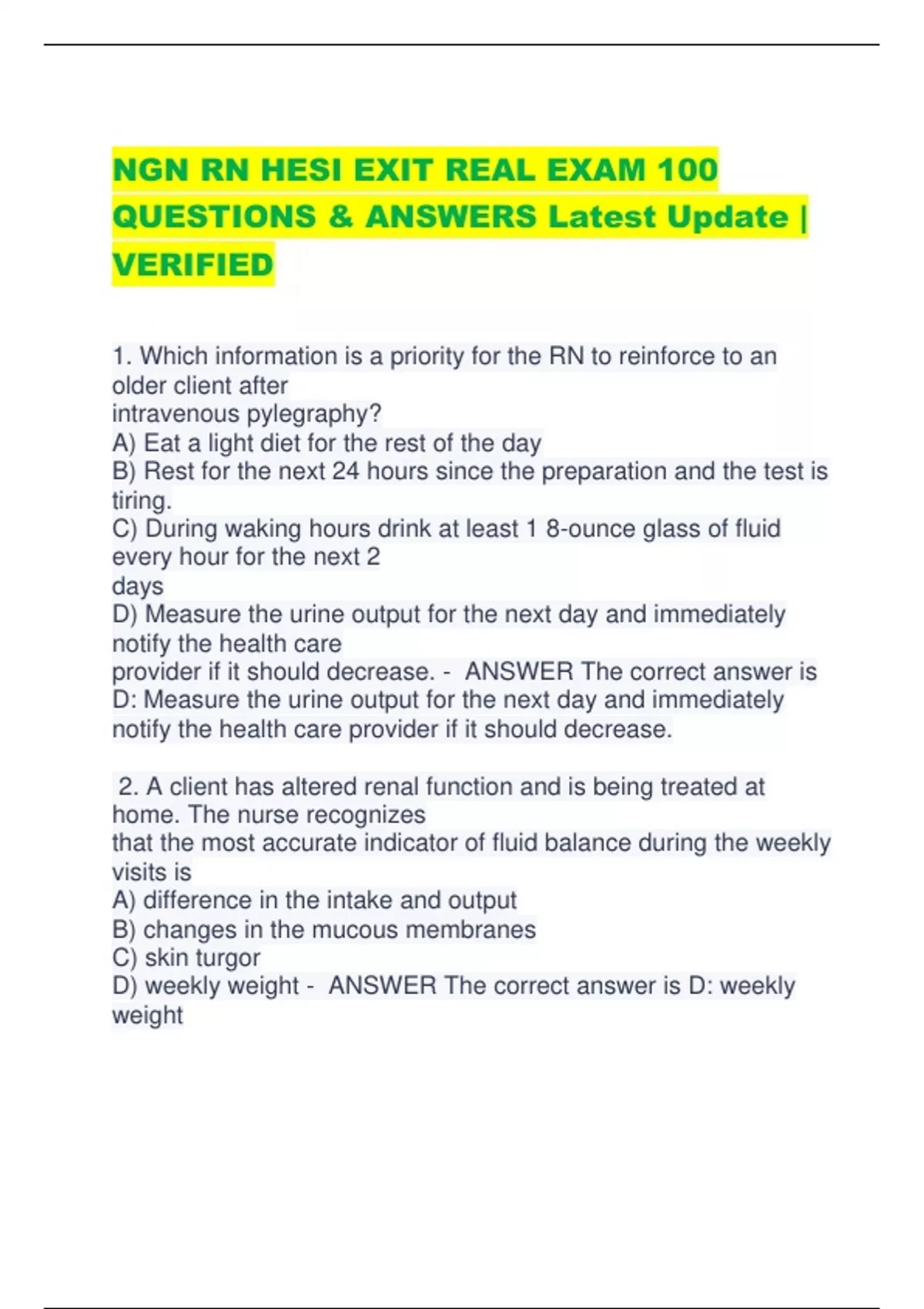NGN RN HESI EXIT REAL EXAM 100 QUESTIONS & ANSWERS Latest Update | VERIFIED 1. Which information is a priority for the RN to reinforce to an older client after intravenous pylegraphy? A) Eat a light diet for the rest of the day B) Rest for the next 24 hours since the preparation and the test is tiring. C) During waking hours drink at least 1 8-ounce glass of fluid every hour for the next 2 days D) Measure the urine output for the next day and immediately notify the health care provider if it should decrease. - ANSWER The correct answer is D: Measure the urine output for the next day and immediately notify the health care provider if it should decrease. 2. A client has altered renal function and is being treated at home. The nurse recognizes that the most accurate indicator of fluid balance during the weekly visits is A) difference in the intake and output B) changes in the mucous membranes C) skin turgor D) weekly weight - ANSWER The correct answer is D: weekly weight 3. A client has been diagnosed with Zollinger-Ellison syndrome.Which information is most important for the nurse to reinforce with the client? A)It is a condition in which one or more tumors called gastrinomas form in the pancreas or in the upper part of the small intestine (duodenum) B)It is critical to report promptly to your health care provider any findings of peptic ulcers c)Treatment consists of medications to reduce acid and heal any peptic ulcers and, if possible, surgery to remove any tumors D)With the average age at diagnosis at 50 years the peptic ulcers may occur at unusual areas of the stomach or intestine - ANSWER The correct answer is B: It is critical to report promptly to your health care provider any findings of peptic ulcers. 4. A primigravida in the third trimester is hospitalized for preeclampsia. The nurse determines that the client's blood pressure is increasing. Which action should the nurse take first? A) Check the protein level in urine B) Have the client turn to the left side C) Take the temperature D) Monitor the urine output - ANSWER The correct answer is B: Have the client turn to the left side 5. The nurse is caring for a client in atrial fibrillation. The atrial heart rate is 250 and the ventricular rate is controlled at 75. Which of the following findings is cause for the most concern? A) Diminished bowel sounds B) Loss of appetite C) A cold, pale lower leg D) Tachypnea - ANSWER The correct answer is C: A cold, pale lower leg 6. The client with infective endocarditis must be assessed frequently by the home health nurse. Which finding suggests that antibiotic therapy is not effective, and must be reported