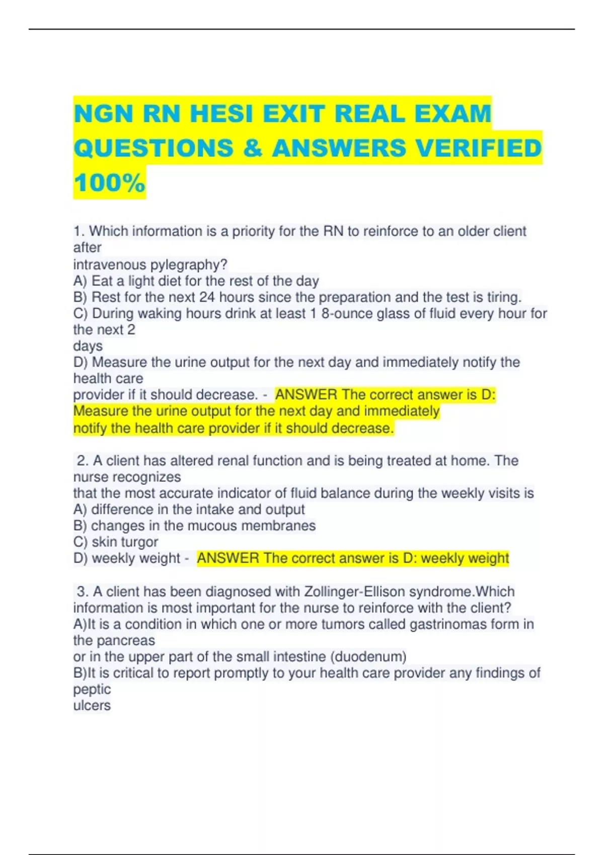NGN RN HESI EXIT REAL EXAM QUESTIONS & ANSWERS VERIFIED 100% 1. Which information is a priority for the RN to reinforce to an older client after intravenous pylegraphy? A) Eat a light diet for the rest of the day B) Rest for the next 24 hours since the preparation and the test is tiring. C) During waking hours drink at least 1 8-ounce glass of fluid every hour for the next 2 days D) Measure the urine output for the next day and immediately notify the health care provider if it should decrease. - ANSWER The correct answer is D: Measure the urine output for the next day and immediately notify the health care provider if it should decrease. 2. A client has altered renal function and is being treated at home. The nurse recognizes that the most accurate indicator of fluid balance during the weekly visits is A) difference in the intake and output B) changes in the mucous membranes C) skin turgor D) weekly weight - ANSWER The correct answer is D: weekly weight 3. A client has been diagnosed with Zollinger-Ellison syndrome.Which information is most important for the nurse to reinforce with the client? A)It is a condition in which one or more tumors called gastrinomas form in the pancreas or in the upper part of the small intestine (duodenum) B)It is critical to report promptly to your health care provider any findings of peptic ulcers c)Treatment consists of medications to reduce acid and heal any peptic ulcers and, if possible, surgery to remove any tumors D)With the average age at diagnosis at 50 years the peptic ulcers may occur at unusual areas of the stomach or intestine - ANSWER The correct answer is B: It is critical to report promptly to your health care provider any findings of peptic ulcers. 4. A primigravida in the third trimester is hospitalized for preeclampsia. The nurse determines that the client's blood pressure is increasing. Which action should the nurse take first? A) Check the protein level in urine B) Have the client turn to the left side C) Take the temperature D) Monitor the urine output - ANSWER The correct answer is B: Have the client turn to the l
