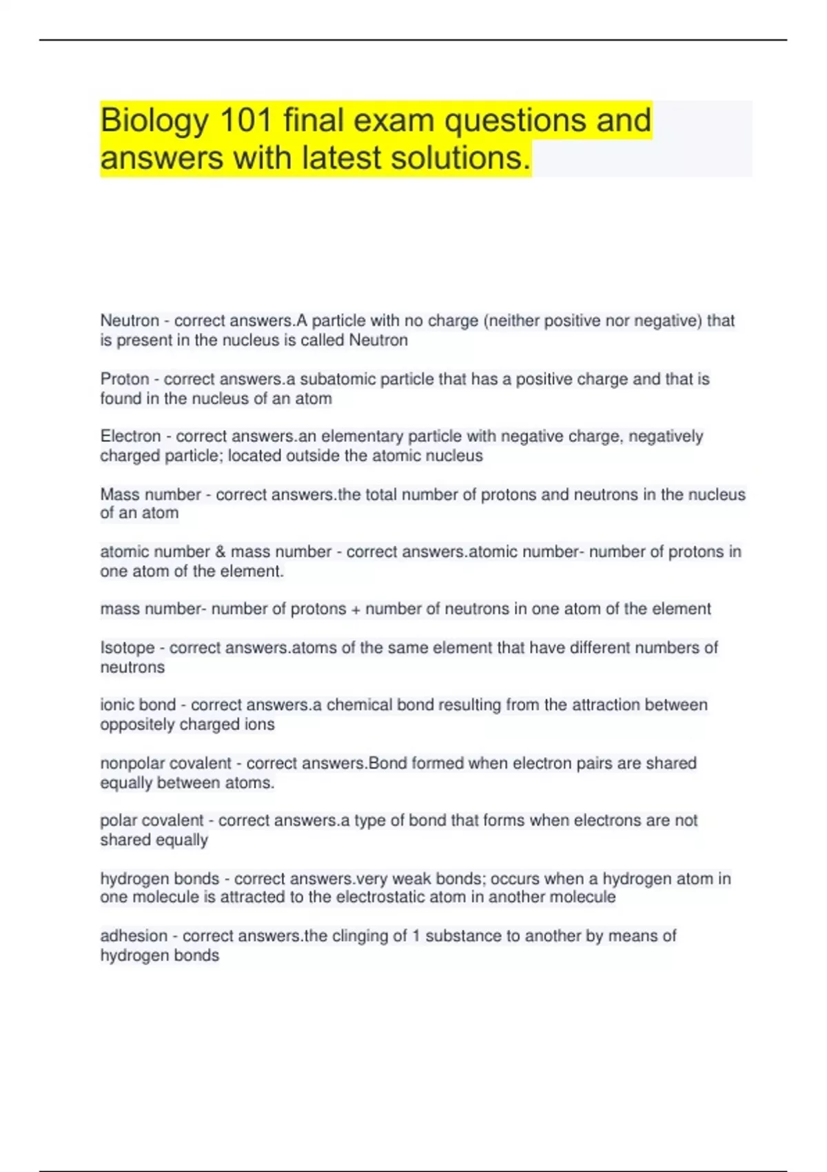 Biology 101 final exam questions and answers with latest solutions. Neutron - correct answers.A particle with no charge (neither positive nor negative) that is present in the nucleus is called Neutron Proton - correct answers.a subatomic particle that has a positive charge and that is found in the nucleus of an atom Electron - correct elementary particle with negative charge, negatively charged particle; located outside the atomic nucleus Mass number - correct total number of protons and neutrons in the nucleus of an atom atomic number & mass number - correct c number- number of protons in one atom of the element. mass number- number of protons + number of neutrons in one atom of the element Isotope - correct of the same element that have different numbers of neutrons ionic bond - correct answers.a chemical bond resulting from the attraction between oppositely charged ions nonpolar covalent - correct answers.Bond formed when electron pairs are shared equally between atoms. polar covalent - correct answers.a type of bond that forms when electrons are not shared equally hydrogen bonds - correct weak bonds; occurs when a hydrogen atom in one molecule is attracted to the electrostatic atom in another molecule adhesion - correct clinging of 1 substance to another by means of hydrogen bonds cohesion - correct ncy of molecules of the same kind to stick to one another surface tension - correct answers.A measure of how difficult it is to stretch or break the surface of a liquid. Water has a high surface tension because of the hydrogen bonding of surface molecules. solute - correct dissolved substance in a solution solution - correct answers.a homogeneous mixture of two or more substances solvent - correct answers.a liquid substance capable of dissolving other substances acid - correct und that donates H+ ions to an aqueous solution and measures less than 7 on the pH scale base - correct substance that forms hydroxide ions in water and has a pH above 7 ph - correct answers.A measure of hydrogen ion concentration equal to -log [H+] and ranging in value from 0 to 14. 4 classes of macromolecules - correct answers.A. Carbohydrates. B. Lipids. C. Proteins. D. Nucleic Acids. dehydration synthesis - correct answers.A chemical reaction in which two molecules covalently bond to each other with the removal of a water molecule. hydrolysis - correct answers.Breaking down complex molecules by the chemical addition of water proteins - correct ins carbon, hydrogen, oxygen, and nitrogen. source of energy. needed by tissue for repair and growth. made up of 20 amino acids. carbohydrates - correct und made up of carbon, hydrogen, and oxygen atoms; major source of energy for the human body lipids - correct emicals that do not dissolve in water (fats, oils, and waxes) make up cell membranes, store energy nucleic acids - correct answers.Polymers assembled from individual nucleotides; used to store and transmit hereditary, or genetic, information; the two kinds of nucleic acids are ribonucleic acid (RNA) and deoxyribonucleic acid (DNA) (p. 47). 4 structural levels of a protein - correct answers.Primary (First), Secondary (Second), Tertiary (Third), Quaternary (Fourth)