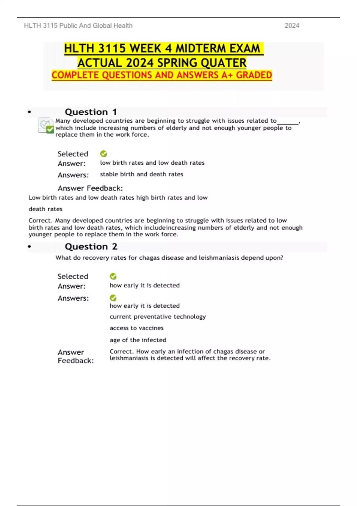 Many developed countries are beginning to struggle with issues related to , which include increasing numbers of elderly and not enough younger people to replace them in the work force. Selected Answer: low birth rates and low death rates Answers: stable birth and death rates Answer Feedback: Low birth rates and low death rates high birth rates and low death rates Correct. Many developed countries are beginning to struggle with issues related to low birth rates and low death rates, which include increasing numbers of elderly and not enough younger people to replace them in the work force. What do recovery rates for chagas disease and leishmaniasis depend upon? Selected Answer: how early it is detected Answers: Answer Feedback: how early it is detected current preventative technology access to vaccines age of the infected Correct. How early an infection of chagas disease or leishmaniasis is detected will affect the recovery rate. The laws, regulations, and priorities that govern your community or state and how these components influence the health of individual citizens are known as which type of health determinant? Selected Answer: Policymaking Answers: Health services Answer Feedback: Policymaking Biology and genetics Individual behavior Correct. The laws, regulations, and priorities that govern your community or state and how these components influence the health of individual citizens are known as policymaking determinants of health. Which MDG addresses waterborne diseases? Selected Answer: MDG 7 Answers: MDG 7 MDG 2 MDG 1 MDG 8 Answer Feedback: Correct. MDG 7 focuses on environmental sustainability, which directly impacts waterborne diseases. According to MDG 7, how can participating nations of the UN combat global climate change? Selected Answer: reduce carbon levels and deforestation Answers: ensure safe housing reduce population in slum areas provide water and sanitation Answer Feedback: reduce carbon levels and deforestation Correct. By reducing carbon levels and deforestation, participating nations can combat climate change. When does population growth occur? Selected Answer: When death rates decline before birth rates decline Answers: Answer Feedback: When death rates decline before birth rates decline When birth rates and death rates do not change When birth rates and death rates decline simultaneously When birth rates decline before death rates decline Correct. Population growth occurs when death rates decline before birth rates decline Which of the following measures how many births have occurred in a year per 1,000 people in a population? Selected Answer: Crude birth rate Answers: J-Curve Demography Answer Feedback: Crude birth rate Total fertility rate Correct. The crude birth rate measures how many births have occurred in a year per 1,000 people in a population. Why don't the same control methods work for all types of vectors? Selected Answer: differing feeding patterns Answers: Answer Feedback: differing feeding patterns human movement unintended consequences varying disease treatments Correct. Since vectors vary widely in many ways including feeding patterns, tailor-made control measures are needed for various vectors. In highly populated urban areas in , many children suffer from asthma and respiratory illness to a much greater degree than most anywhere else in the world as the result of air pollution due to industrialization and dense populations. Selected Answer: China Answers: Bolivia Afghanistan Answer Feedback: China Correct. In highly populated urban areas in China, many children suffer from asthma and respiratory illness to a much greater degree than most anywhere else in the world as the result of air pollution due to industrialization and dense populations. The design and implementation of must factor in local cultural belief systems and practices. Selected health interventions Answer: Answers: human ecologies health equities HRBAs Answer Feedback: health interventions Correct. Health care providers need to keep local cultural belief systems and practices in mind when designing health interventions. Which of the following diseases was spread through the movement of goods and people across borders from Asia into Europe and on to the Americas during the nineteenth century? Selected Answer: Cholera Answers: Yellow Fever Black Death Answer Feedback: Cholera Leprosy Correct. Cholera was spread through the movement of goods and people across borders from Asia into Europe and on to the Americas during the nineteenth century. In addition to political stability, the ability to is important in the prevention and treatment of HIV/AIDS. Selected Answer: Impart new cultural beliefs Answers: Answer Feedback: Implement public policy Communicate political philosophies Impart new cultural beliefs Incorrect. Imparting new cultural beliefs is not important in the prevention and treatment of HIV/AIDS. The parasitic disease that is transmitted by mosquitoes and is particularly prevalent in Southeast Asia and sub-Saharan Africa is called: Selected Answer: Malaria Answers: Typhoid Schistosomiasis Dengue Answer Feedback: Malaria Correct. Malaria is a parasitic disease that is transmitted by mosquitoes and is particularly prevalent in Southeast Asia and sub- Saharan Africa. The three communicable diseases that are the leading causes of death globally are HIV/AIDS, malaria, and . Selected Answer: Tuberculosis Answers: Diabetes Asthma Answer Feedback: Tuberculosis Heart disease Correct. The three communicable diseases that are major killers as well as sources of illness and poverty in developing regions, especially in sub-Saharan Africa, are HIV/AIDS, malaria, and tuberculosis Which of the following calculations include deaths from specific causes in the numerator and the number of people at risk for dying from that cause in the denominator? Selected Answer: Cause-specific mortality Answers: Incidence