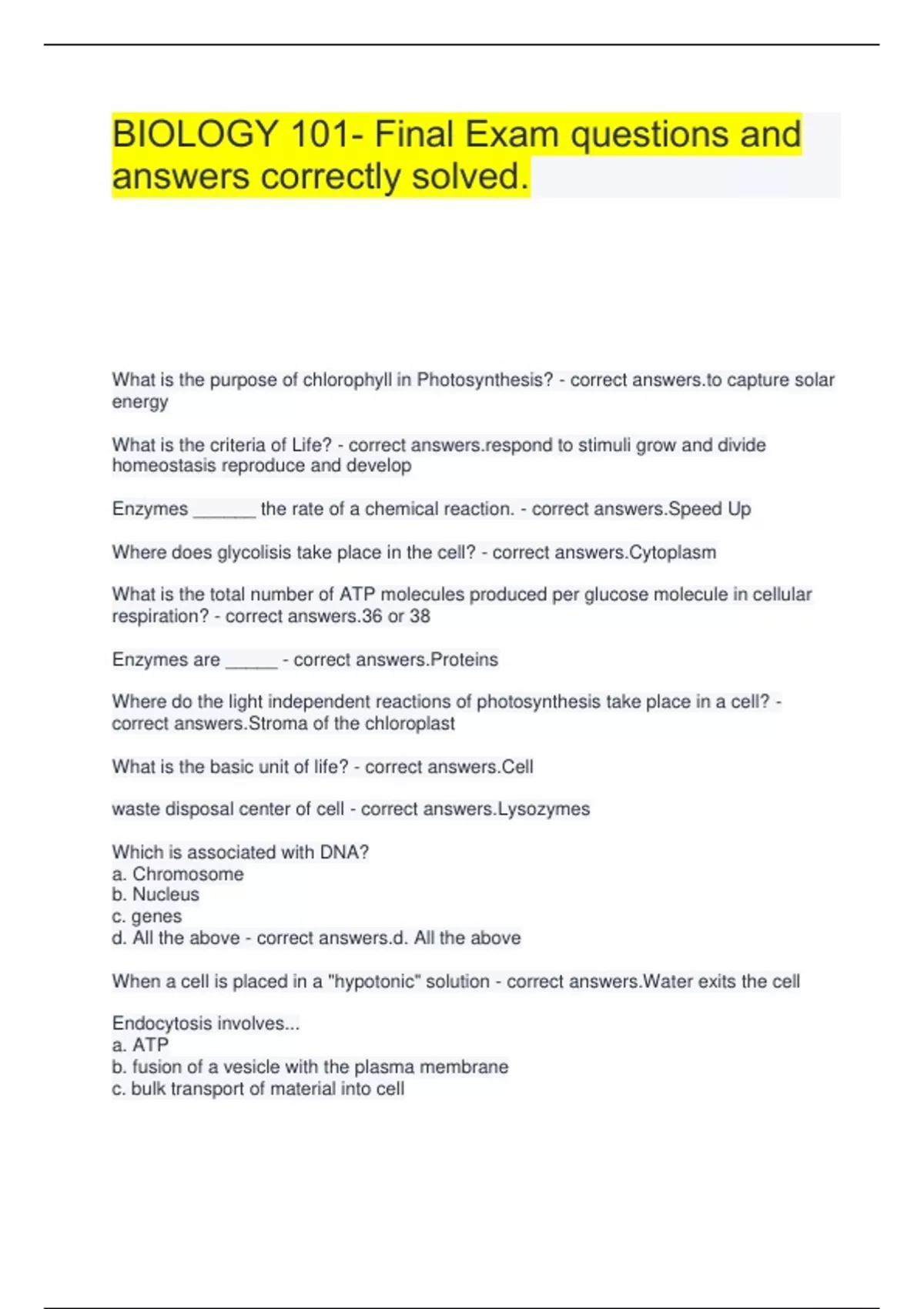 BIOLOGY 101- Final Exam questions and answers correctly solved. What is the purpose of chlorophyll in Photosynthesis? - correct capture solar energy What is the criteria of Life? - correct nd to stimuli grow and divide homeostasis reproduce and develop Enzymes ______ the rate of a chemical reaction. - correct answers.Speed Up Where does glycolisis take place in the cell? - correct answers.Cytoplasm What is the total number of ATP molecules produced per glucose molecule in cellular respiration? - correct answers.36 or 38 Enzymes are _____ - correct answers.Proteins Where do the light independent reactions of photosynthesis take place in a cell? - correct answers.Stroma of the chloroplast What is the basic unit of life? - correct answers.Cell waste disposal center of cell - correct answers.Lysozymes Which is associated with DNA? a. Chromosome b. Nucleus c. genes d. All the above - correct answers.d. All the above When a cell is placed in a "hypotonic" solution - correct answers.Water exits the cell Endocytosis involves... a. ATP b. fusion of a vesicle with the plasma membrane c. bulk transport of material into cell d. all the above - correct answers.d. All the above Taxonomy is the study of: - correct answers.Classification of all living things Mitochondria is.... - correct involved in cellular respiration, membrane bound organelle, contains stroma, have a convoluted outer membrane. An ATP molecule has _____ phosphates attached? - correct answers.3 Which organism is an example of an autotroph? a. Human b. Cow c. Green Plant e. E. Coli - correct answers.c. Green Plant Any energy transformation involves the loss of some energy as.... - correct answers.Heat An antibiotic like penicillin is effective as an antimicrobial drug because it... - correct as a mimic for the correct substrate often targets bacterial cellular components What are possible products for fermentation? - correct ol, lactic acid, carbon dioxide The color, temperature and foul odor of flowers of the titan arum are examples of - correct ations During photosynthesis, carbon dioxide... - correct reduced to glucose A phospholipid molecule has a head and two lipid tails. The tails are found: - correct answers.In the interior of the membrane Active transport across a cell membrane... - correct res a carrier protein moves a molecule against the concentration gradient Energy is brought into ecosystems by... - correct answers.Organisms that photosynthesize, like plants Na/K Pump - correct y one associated to obesity utilizes ATP to transport ions against the concentration gradient actively transport ions across the membrane active site is part of the.... - correct e where the substrate can fit The ETC - correct ves the inner membrane of mitochondria