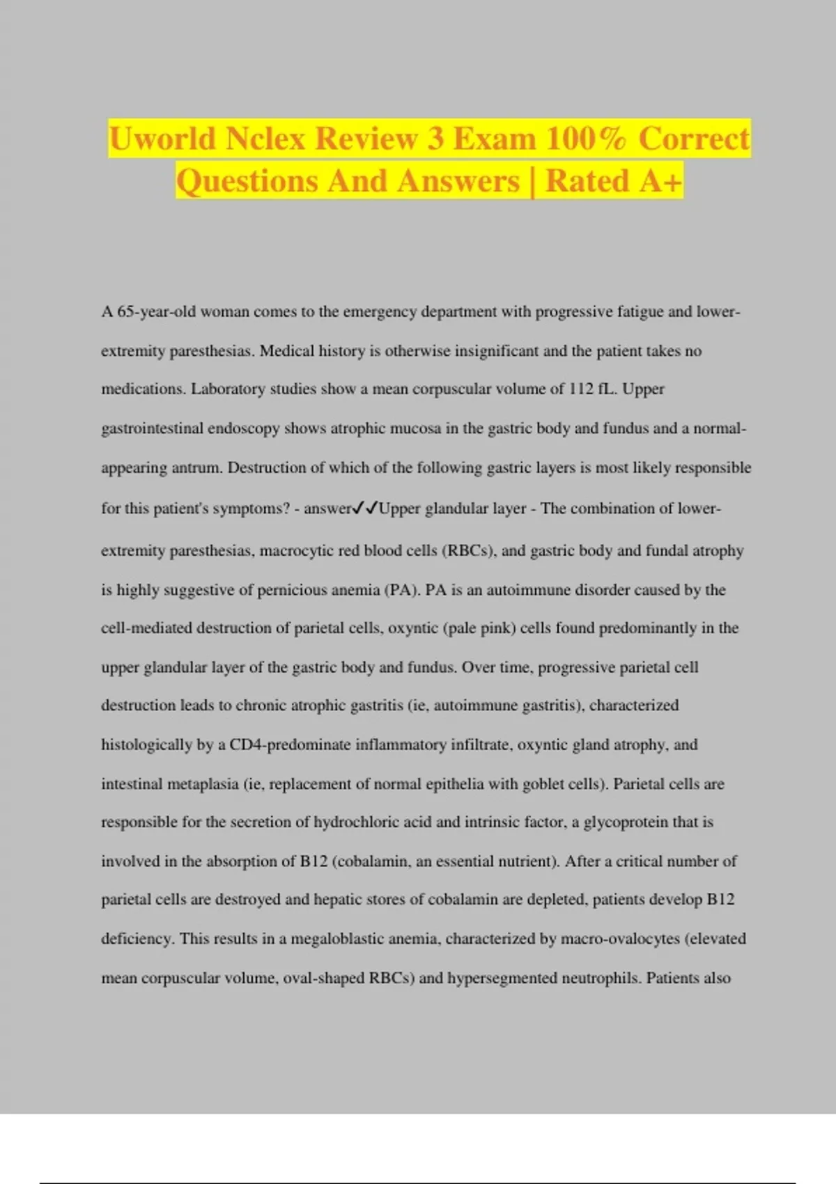 Uworld Nclex Review 3 Exam 100% Correct Questions And Answers | Rated A+ A 65-year-old woman comes to the emergency department with progressive fatigue and lower- extremity paresthesias. Medical history is otherwise insignificant and the patient takes no medications. Laboratory studies show a mean corpuscular volume of 112 fL. Upper gastrointestinal endoscopy shows atrophic mucosa in the gastric body and fundus and a normal- appearing antrum. Destruction of which of the following gastric layers is most likely responsible for this patient's symptoms? - answerUpper glandular layer - The combination of lower- extremity paresthesias, macrocytic red blood cells (RBCs), and gastric body and fundal atrophy is highly suggestive of pernicious anemia (PA). PA is an autoimmune disorder caused by the cell-mediated destruction of parietal cells, oxyntic (pale pink) cells found predominantly in the upper glandular layer of the gastric body and fundus. Over time, progressive parietal cell destruction leads to chronic atrophic gastritis (ie, autoimmune gastritis), characterized histologically by a CD4-predominate inflammatory infiltrate, oxyntic gland atrophy, and intestinal metaplasia (ie, replacement of normal epithelia with goblet cells). Parietal cells are responsible for the secretion of hydrochloric acid and intrinsic factor, a glycoprotein that is involved in the absorption of B12 (cobalamin, an essential nutrient). After a critical number of parietal cells are destroyed and hepatic stores of cobalamin are depleted, patients develop B12 deficiency. This results in a megaloblastic anemia, characterized by macro-ovalocytes (elevated mean corpuscular volume, oval-shaped RBCs) and hypersegmented neutrophils. Patients also develop neurologic dysfunction due to demyelination of the dorsal and lateral spinal tracts, resulting in paresthesias and ataxia. A 69-year-old hospitalized woman is evaluated for new-onset weakness of the right foot. The patient has a history of chronic hip pain due to osteoarthritis and underwent left total hip arthroplasty under general anesthesia while in the right lateral decubitus position 2 days ago. Since the surgery, she has had difficulty moving her right foot. Other medical conditions include lumbar spinal stenosis, hypertension, type 2 diabetes mellitus, and a small ischemic stroke with no residual deficit. On examination of the right lower extremity, the patient is unable to dorsiflex or evert the foot or extend the toes. Sensation is decreased over the dorsum of the right foot. The rest of the neurologic examination of the right lower extremity is normal. Injury to which of the following structures is the most likely cause of this patient's current symptoms? - answerCommon fibular nerve - The common fibular (peroneal) nerve originates in the popliteal fossa as the lateral branch of the sciatic nerve. From there, it courses laterally around the head and neck of the fibula before dividing into the deep and superficial fibular nerves. Because of its proximity to the lateral neck of the fibula, the common fibular nerve is particularly susceptible to compression from a leg cast or during prolonged time in the lateral decubitus position (eg, during surgical procedures). Common fibular neuropathy characteristically presents with deficits involving both the deep fibular (eg, weakness in foot dorsiflexion and toe extension) and the superficial fibular (eg, weakness in foot eversion, sensory loss over the dorsal foot) nerves. In an ambulatory patient, gait examination typically shows foot drop due to loss of dorsiflexion, with the affected foot lifted high off the ground to compensate (ie, steppage gait). A 45-year-old man comes to the hospital with acute onset of severe chest pain and diaphoresis. The patient describes the pain as "squeezing," different from any discomfort he has ever had. He has a past medical history of hypertension, and his father underwent coronary artery bypass grafting at age 50. The patient is diagnosed with acute ST-elevation myocardial infarction and undergoes an urgent coronary intervention with stent placement into the right coronary artery. He is also started on high-intensity atorvastatin therapy, along with antiplatelet therapy and appropriate medications to control blood pressure. Four weeks later, the patient's total cholesterol level is 140 mg/dL, down from 200 mg/dL before discharge. Which of the following has most likely increased as the result of the therapy? - answerLDL receptor density - HMG-CoA reductase inhibitors (statins) inhibit the rate-limiting enzyme in hepatic cholesterol synthesis. In response to these changes, hepatocytes increase their surface expression of the LDL receptor to increase uptake of circulating LDL. Treatment generally produces a 20%-50% reduction in serum cholesterol and LDL concentration. A 36-year-old man comes to the office for follow-up regarding hepatitis C. The patient was last seen 3 years ago for a 2-week history of fatigue, nausea, and decreased appetite; at that time, he was diagnosed with hepatitis C infection due to injection drug use. The patient was offered treatment but declined. He is currently healthy and feels well. There is no family history of liver disease. The patient currently does not use illicit drugs or alcohol. Vital signs are normal. BMI is 26 kg/m2. Examination is normal. Laboratory results are as follows: Albumin 3.6 g/dL Total bilirubin 1.7 mg/dL Aspartate aminotransferase (SGOT) 54 U/L Alanine aminotransferase (SGPT) 62 U/L Hepatitis B surface antigen negative Hepatitis B surface antibody positive Anti-hepatitis C virus antibody positive Hepatitis C RNA positive HIV antibody negative Liver ultrasound is negative for cirrhosis or masses. If a liver biopsy is performed, wh - answerLymphocytic infiltration of portal tracts - Most cases of Hepatitis C (~80%) progress to chronic HCV, which is predominantly characterized by portal tract-based lymphocytic infiltration, including lymphoid 