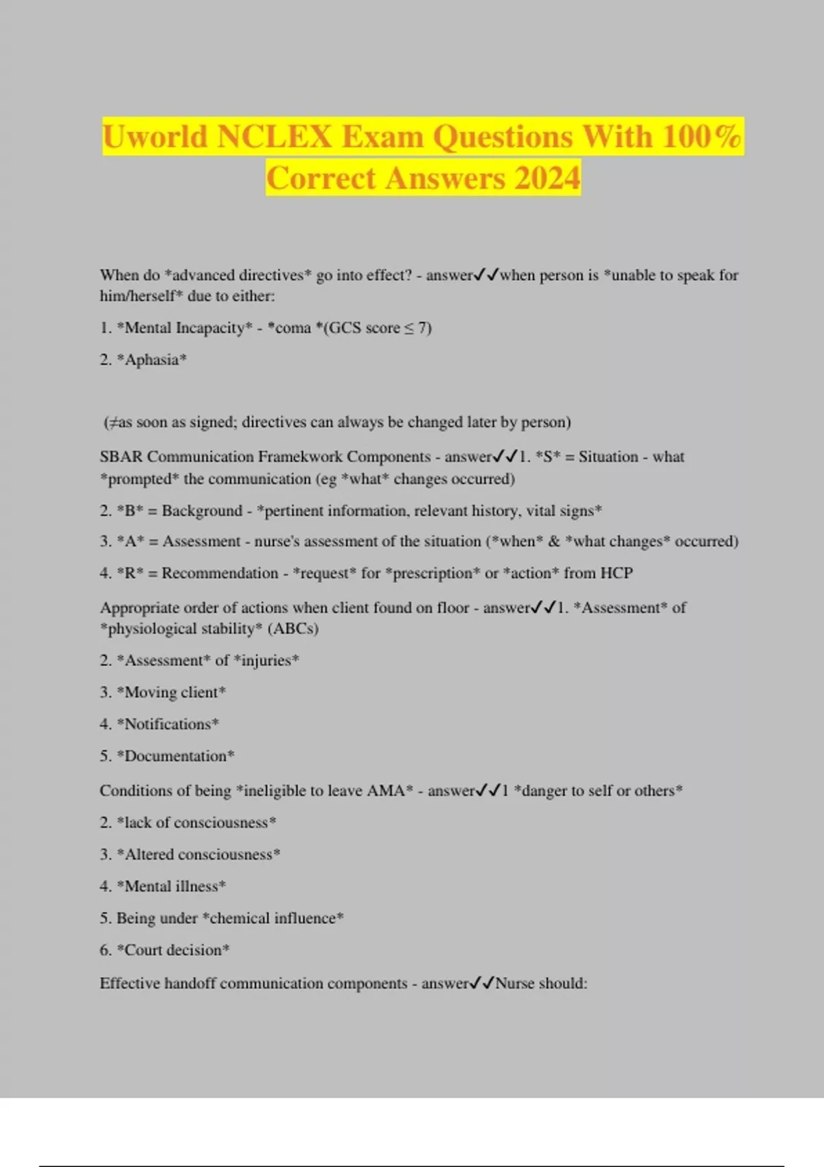 Uworld NCLEX Exam Questions With 100% Correct Answers 2024 When do *advanced directives* go into effect? - answerwhen person is *unable to speak for him/herself* due to either: 1. *Mental Incapacity* - *coma *(GCS score ≤ 7) 2. *Aphasia* (≠as soon as signed; directives can always be changed later by person) SBAR Communication Framekwork Components - answer1. *S* = Situation - what *prompted* the communication (eg *what* changes occurred) 2. *B* = Background - *pertinent information, relevant history, vital signs* 3. *A* = Assessment - nurse's assessment of the situation (*when* & *what changes* occurred) 4. *R* = Recommendation - *request* for *prescription* or *action* from HCP Appropriate order of actions when client found on floor - answer1. *Assessment* of *physiological stability* (ABCs) 2. *Assessment* of *injuries* 3. *Moving client* 4. *Notifications* 5. *Documentation* Conditions of being *ineligible to leave AMA* - answer1 *danger to self or others* 2. *lack of consciousness* 3. *Altered consciousness* 4. *Mental illness* 5. Being under *chemical influence* 6. *Court decision* Effective handoff communication components - answerNurse should: 1. Provide *identifying information* (eg client's name and room number) 2. Note *care priorities* and upcoming or outstanding tasks (eg time to replace medication infusion bag, need to perform delayed wound care and cause of delay) 3. Provide *exact, pertinent information* (eg medication dose, time, measurable outcomes) 4. Include *multidisciplinary plans* (eg radiology examinations, family meetings, physical therapy) 5. Relay significant client changes in a clear manner *Risk factors* for *cervical cancer* - answer1. Infection with high-risk HPV strains 2. History of sexually transmitted diseases 3. Early onset of sexual activity 4. Multiple or high-risk sexual partners 5. Immunosuppression 6. Oral contraceptive use 7. Low SES 8. Tobacco use what medications interact with grapefruit? - answer1. *calcium channel blockers* (diltiazem, nifedipine, verapamil, etc) 2. *statins* 3. *SSRIs* Risk associated with *stent placement* using the *femoral approach* - answer*retroperitoneal hemorrhage* what are early signs of bleeding into the retroperitoneal space? - answerhypotension, back pain, flank ecchymosis (grey turner sign), hematoma formation, diminshed distal pulses what is the grey-turner sign and what is it a sign of? - answerbruising of the flanks and retroperitoneal hemorrhage and is a bluish color what are some physical signs of peripheral arterial disease? - answerintermittent calf muscle pain?, rest pain, hair loss, decreased peripheral pulses, cool, dry, shiny skin, thick brittle nails, gangrene, ulcers (all of these are in the extremities) transplanted hearts are expected to be - answertachycardic like 90-110 what is the priority intervention for pain with sickle cell crisis and why? - answeradminister IV fluids to reduce blood viscosity and restore perfusion to areas affected by vasoocclusion what is the purpose of continuous bladder irrigation? - answerit is perscribed after TURP to prevent obstruction of urine outflow by removing clotted blood from the bladder what is the nurses care of monitoring CBI? - answermonitor quality of drainage, titrate the inflow rate, and manurally irrigating as needed characteristics of a basilar skull fracture - answerperiorbital hematomas (raccoon eyes), csf fluid rhinorrhea, and battle sign (behind the ear bruising) immediate client care for basilar skull fracture - answercervical spime immobilization, close neurologic monitoring, and support of ABCs vomiting with intake may mean - answerviral or bacterial infection tympanosomty tubes are placed for - answerrecurrent otis medias nurse actions during a seizure - answerassist them to lie down is standing/sitting, put them on side for patent airway, loosen tight clothing, give oxygen as needed, remove objects from immediate area, document time and duration of seizure (for tests are done later to see which type of seizure and maybe what exacerates it) never put anything in mouth or restrain them since musclec ontractions can occur during a seizure what are some early symptoms of ICP? - answeraltered LOC, headache, abnormal reathing, rise in bp, slow pulse, vomiting client who has a TIA is often placed on - answerprophylactic antithrombotic treatment like aspirin or clopidogrel glascow coma scale ranges from - answer3-15; 3 being worst 15 being best condition (8 or below in a coma) what are the 3 components? - answereye opening motor response verbal response what is a primary component in TPN? - answer*glucose,* so the nurse should be monitoring blood glucose and be assessing for signs of hyperglycemia when a client is on TPN, the nurse must assess for hyperglycemia why? - answerbc a primary component is glucose. therefore the nurse must be assessing to see if the client is getting too much glucose (hoerglycemia). and with a large urinary output like 4800, this could indicate symptoms of hyperglycemia signs of hyperglycemia - answer- polydipsia, - polyuria, - restless, - confused, - bg over 200, - fatigue, - headache - blurred vision - kussmaul resp Interventions to resolve TPN-associated hyperglycemia - answer- reduce amount of carbohydrate in TPN solution - slow down infusion rate - administer subcutaneous insulin what is the goal for mass casualty events? - answerdo the greatest good for the greatest number of people keep in mind that disaster triage ranks the likelihood of survival with treatment, not necessarily the severity of the injury - answer what are the 4 categories for triaging? - answerimmediate (red tag)- life threatening injuries with good prognosis once treated delayed (yellow)- injuries requiring treatment within hours minimal (green tag)- injuries requiring treatment within a few days expectant (black tag)- extensive injuries, poor prognosis regardless of treatment rule of nines - answerhead: 4.5 front 4.5 back torso: 18 front 18 bac