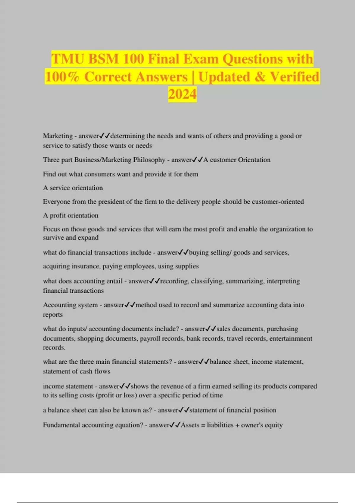 TMU BSM 100 Final Exam Questions with 100% Correct Answers | Updated & Verified 2024 Marketing - answerdetermining the needs and wants of others and providing a good or service to satisfy those wants or needs Three part Business/Marketing Philosophy - answerA customer Orientation Find out what consumers want and provide it for them A service orientation Everyone from the president of the firm to the delivery people should be customer-oriented A profit orientation Focus on those goods and services that will earn the most profit and enable the organization to survive and expand what do financial transactions include - answerbuying selling/ goods and services, acquiring insurance, paying employees, using supplies what does accounting entail - answerrecording, classifying, summarizing, interpreting financial transactions Accounting system - answermethod used to record and summarize accounting data into reports what do inputs/ accounting documents include? - answersales documents, purchasing documents, shopping documents, payroll records, bank records, travel records, entertainmnent records. what are the three main financial statements? - answerbalance sheet, income statement, statement of cash flows income statement - answershows the revenue of a firm earned selling its products compared to its selling costs (profit or loss) over a specific period of time a balance sheet can also be known as? - answerstatement of financial position Fundamental accounting equation? - answerAssets = liabilities + owner's equity
