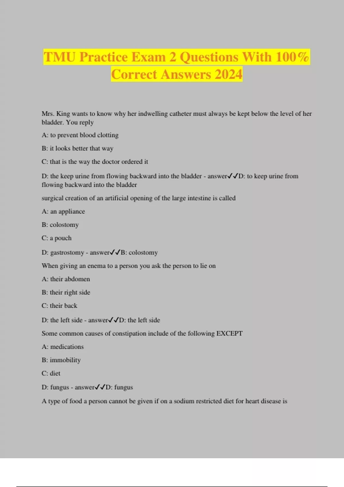 TMU Practice Exam 2 Questions With 100% Correct Answers 2024 Mrs. King wants to know why her indwelling catheter must always be kept below the level of her bladder. You reply A: to prevent blood clotting B: it looks better that way C: that is the way the doctor ordered it D: the keep urine from flowing backward into the bladder - answerD: to keep urine from flowing backward into the bladder surgical creation of an artificial opening of the large intestine is called A: an appliance B: colostomy C: a pouch D: gastrostomy - answerB: colostomy When giving an enema to a person you ask the person to lie on A: their abdomen B: their right side C: their back D: the left side - answerD: the left side Some common causes of constipation include of the following EXCEPT A: medications B: immobility C: diet D: fungus - answerD: fungus A type of food a person cannot be given if on a sodium restricted diet for heart disease is A: pickles and olives B: hamburger or pears C: fish and potatoes D: carrots or banans - answerA: Pickles and oliv