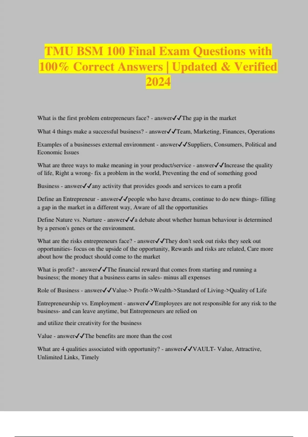 TMU BSM 100 Final Exam Questions with 100% Correct Answers | Updated & Verified 2024 What is the first problem entrepreneurs face? - answerThe gap in the market What 4 things make a successful business? - answerTeam, Marketing, Finances, Operations Examples of a businesses external environment - answerSuppliers, Consumers, Political and Economic Issues What are three ways to make meaning in your product/service - answerIncrease the quality of life, Right a wrong- fix a problem in the world, Preventing the end of something good Business - answerany activity that provides goods and services to earn a profit Define an Entrepreneur - answerpeople who have dreams, continue to do new things- filling a gap in the market in a different way, Aware of all the opportunities Define Nature vs. Nurture - answera debate about whether human behaviour is determined by a person's genes or the environment. What are the risks entrepreneurs face? - answerThey don't seek out risks they seek out opportunities- focus on the upside of the opportunity, Rewards and risks are related, Care more about how the product should come to the market What is profit? - answerThe financial reward that comes from starting and running a business; the money that a business earns in sales- minus all expenses Role of Business - answerValue-> Profit->Wealth->Standard of Living->Quality of Life Entrepreneurship vs. Employment - answerEmployees are not responsible for any risk to the business- and can leave anytime, but Entrepreneurs are relied on and utilize their creativity for the business Value - answerThe benefits are more than the cost What are 4 qualities associated with opportunity? - answerVAULT- Value, Attractive, Unlimited Links, Timely Value proposition - answerthe set of benefits or values that a company promises to deliver to customers to satisfy their needs market research - answerThe activity of gathering information about consumers' needs and preferences. The analysis of markets to assess opportunities, and finding information to make good decisions Market Research Process - answerDefine Problem, Design Research Project, Collect Data, Analyze Data, Take Action Primary vs Secondary Data - answerprimary - up to date, expensive, can be flawed secondary - Data that's already published and available to everyone, Want to go beyond what everyone else knows, Done by experts Visible Characteristics - answerAge, race, income Invisible characteristics - answerValues, attitudes, beliefs Six Elements of Business External Environment - answerThe Economic Environment, Legal environment, Competitive Environment, Technological Environment, Social Environment, The Global Environment Crowdsourcing - answerusing expertise of people to solve a business problem Social Media marketing can... - answermake or break an organization unsurpassed value - answerValue is the gap between benefit and price, The cheapest product does not mean the best value, The key to value is