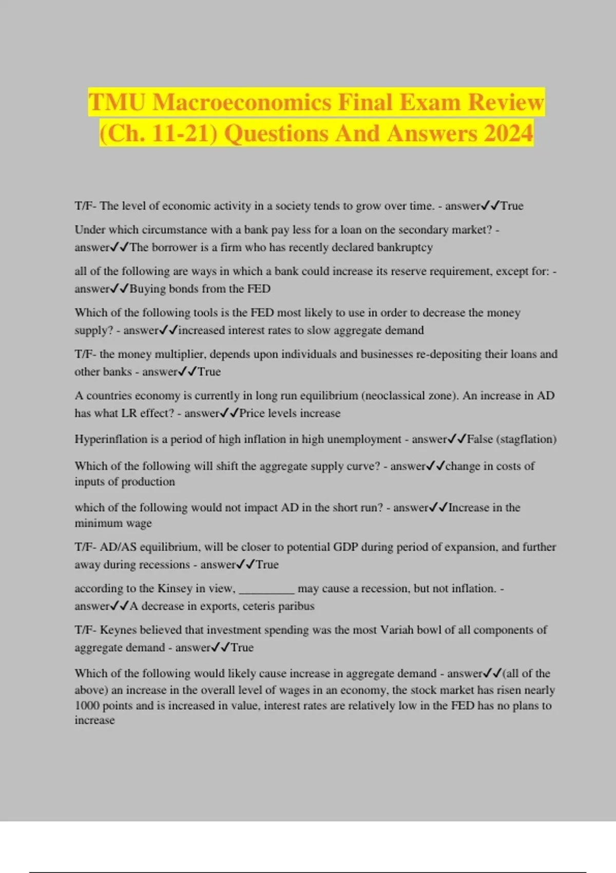 TMU Macroeconomics Final Exam Review (Ch. 11-21) Questions And Answers 2024 T/F- The level of economic activity in a society tends to grow over time. - answerTrue Under which circumstance with a bank pay less for a loan on the secondary market? - answerThe borrower is a firm who has recently declared bankruptcy all of the following are ways in which a bank could increase its reserve requirement, except for: - answerBuying bonds from the FED Which of the following tools is the FED most likely to use in order to decrease the money supply? - answerincreased interest rates to slow aggregate demand T/F- the money multiplier, depends upon individuals and businesses re-depositing their loans and other banks - answerTrue A countries economy is currently in long run equilibrium (neoclassical zone). An increase in AD has what LR effect? - answerPrice levels increase Hyperinflation is a period of high inflation in high unemployment - answerFalse (stagflation) Which of the following will shift the aggregate supply curve? - answerchange in costs of inputs of production which of the following would not impact AD in the short run? - answerIncrease in the minimum wage T/F- AD/AS equilibrium, will be closer to potential GDP during period of expansion, and further away during recessions - answerTrue according to the Kinsey in view, _________ may cause a recession, but not inflation. - answerA decrease in exports, ceteris paribus T/F- Keynes believed that investment spending was the most Variah bowl of all components of aggregate demand - answerTrue Which of the following would likely cause increase in aggregate demand - answer(all of the above) an increase in the overall level of wages in an economy, the stock market has risen nearly 1000 points and is increased in value, interest rates are relatively low in the FED has no plans to increas