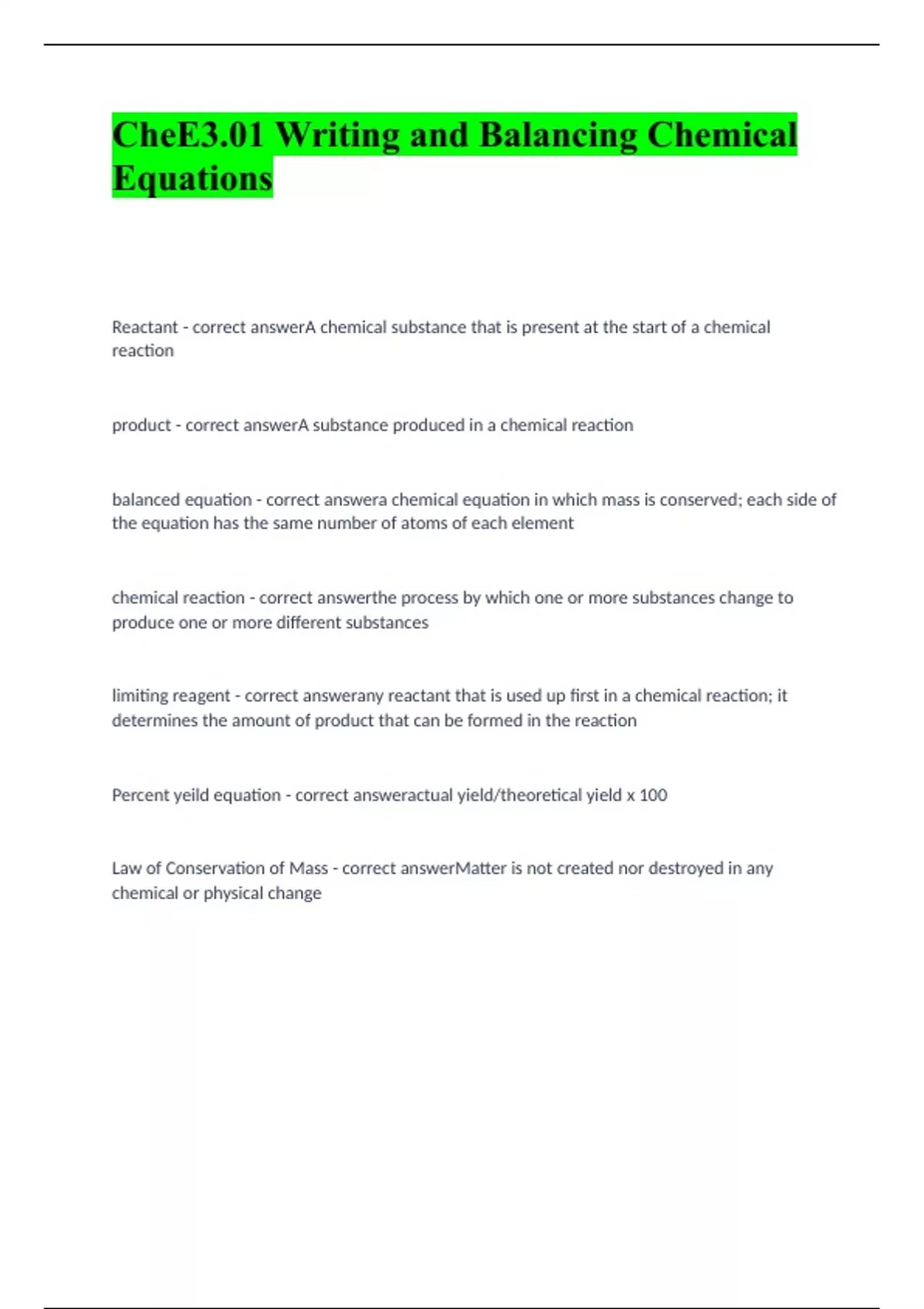CheE3.01 Writing and Balancing Chemical Equations Reactant - correct answerA chemical substance that is present at the start of a chemical reaction product - correct answerA substance produced in a chemical reaction balanced equation - correct answera chemical equation in which mass is conserved; each side of the equation has the same number of atoms of each element chemical reaction - correct answerthe process by which one or more substances change to produce one or more different substances limiting reagent - correct answerany reactant that is used up first in a chemical reaction; it determines the amount of product that can be formed in the reaction