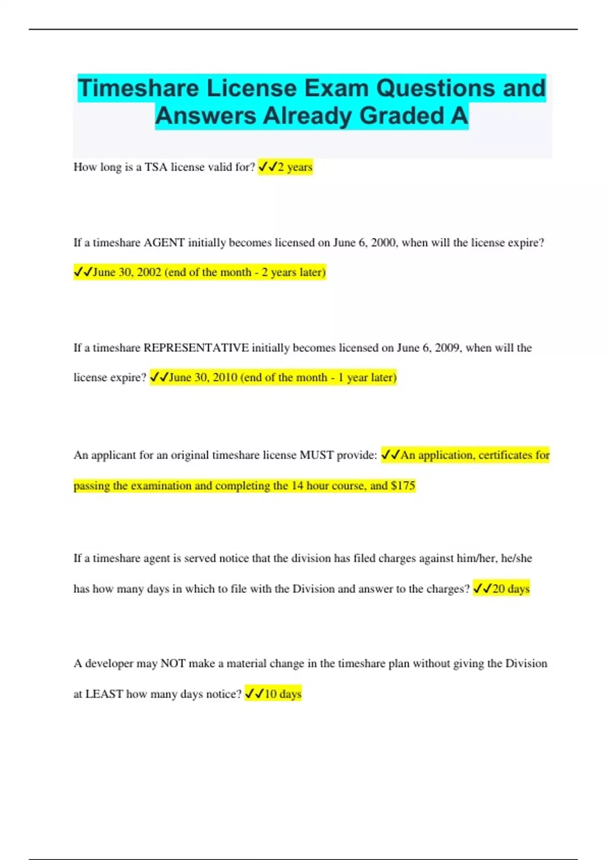 Timeshare License Exam Questions and Answers Already Graded A How long is a TSA license valid for? 2 years If a timeshare AGENT initially becomes licensed on June 6, 2000, when will the license expire? June 30, 2002 (end of the month - 2 years later) If a timeshare REPRESENTATIVE initially becomes licensed on June 6, 2009, when will the license expire? June 30, 2010 (end of the month - 1 year later) An applicant for an original timeshare license MUST provide: An application, certificates for passing the examination and completing the 14 hour course, and $175 If a timeshare agent is served notice that the division has filed charges against him/her, he/she has how many days in which to file with the Division and answer to the charges? 20 days A developer may NOT make a material change in the timeshare plan without giving the Division at LEAST how many days notice? 10 days If the highest monthly total of deposits received by a project is $50,000 what is the amount of surety bond REQUIRED for the benefit of the purchasers? $50,000 What is a timeshare? A guaranteed reservation at the resort of your choice What is a fractional ownership? Ownership of an interval of 1 month to 1/2 year The value of an individual timeshare usually decreases in value An agreement between two or more parties is called a contract The following elements are necessary to create an agency relationship EXCEPT: consideration The following elements are necessary to create an agency relationship: perception of representation, understanding, and reliance Which of the following is NOT necessary to form a contract? performance Which of the following is necessary to form a contract? meeting of the minds, consideration, and competence The essential parts of a written contract include competent parties, mutual consent, consideration, and legal obligation Which statements MUST be printed above the purchaser's signature one in each contract for sale of a timeshare? The purchaser of a timeshare may cancel, by written notice, the contract of sale until midnight of the fifth calendar day