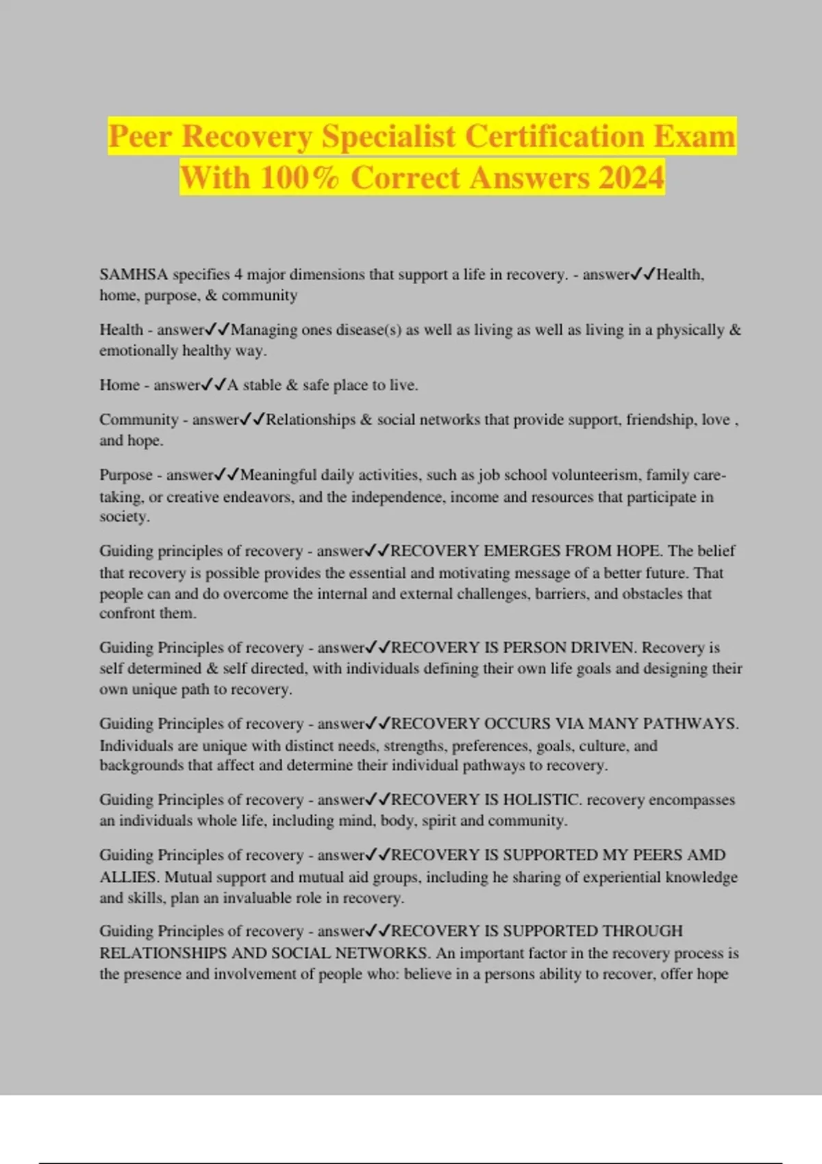 Peer Recovery Specialist Certification Exam With 100% Correct Answers 2024 SAMHSA specifies 4 major dimensions that support a life in recovery. - answerHealth, home, purpose, & community Health - answerManaging ones disease(s) as well as living as well as living in a physically & emotionally healthy way. Home - answerA stable & safe place to live. Community - answerRelationships & social networks that provide support, friendship, love , and hope. Purpose - answerMeaningful daily activities, such as job school volunteerism, family care- taking, or creative endeavors, and the independence, income and resources that participate in society. Guiding principles of recovery - answerRECOVERY EMERGES FROM HOPE. The belief that recovery is possible provides the essential and motivating message of a better future. That people can and do overcome the internal and external challenges, barriers, and obstacles that confront them. Guiding Principles of recovery - answerRECOVERY IS PERSON DRIVEN. Recovery is self determined & self directed, with individuals defining their own life goals and designing their own unique path to recovery. Guiding Principles of recovery - answerRECOVERY OCCURS VIA MANY PATHWAYS. Individuals are unique with distinct needs, strengths, preferences, goals, culture, and backgrounds that affect and determine their individual pathways to recovery. Guiding Principles of recovery - answerRECOVERY IS HOLISTIC. recovery encompasses an individuals whole life, including mind, body, spirit and community. Guiding Principles of recovery - answerRECOVERY IS SUPPORTED MY PEERS AMD ALLIES. Mutual support and mutual aid groups, including he sharing of experiential knowledge and skills, plan an invaluable role in recovery. Guiding Principles of recovery - answerRECOVERY IS SUPPORTED THROUGH RELATIONSHIPS AND SOCIAL NETWORKS. An important factor in the recovery process is the presence and involvement of people who: believe in a persons ability to recover, offer hope support and encouragement. Suggest strategies and resources for change. Role model positive behaviors and attitudes. Guiding Principles of recovery - answerRECOVERY IS CULTURALLY BASED AND INFLUENCED. Culture and cultural background in all of its diverse representations- including values, traditions and beliefs-are keys in determining a persons journey and unique pathway to recovery. Guiding Principles of recovery - answerRECOVERY IS BASED ON RESPECT. Community, systems, societal acceptance and appreciation for people affected by mental health and substance abuse disorders-including protecting their rights and elim