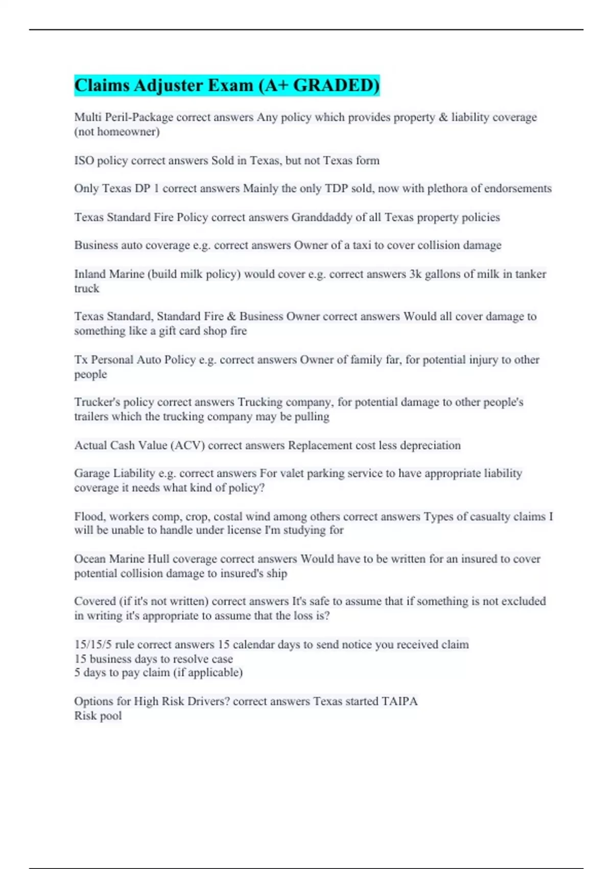 Multi Peril-Package correct answers Any policy which provides property & liability coverage (not homeowner) ISO policy correct answers Sold in Texas, but not Texas form Only Texas DP 1 correct answers Mainly the only TDP sold, now with plethora of endorsements Texas Standard Fire Policy correct answers Granddaddy of all Texas property policies Business auto coverage e.g. correct answers Owner of a taxi to cover collision damage Inland Marine (build milk policy) would cover e.g. correct answers 3k gallons of milk in tanker truck Texas Standard, Standard Fire & Business Owner correct answers Would all cover damage to something like a gift card shop fire Tx Personal Auto Policy e.g. correct answers Owner of family far, for potential injury to other people Trucker's policy correct answers Trucking company, for potential damage to other people's trailers which the trucking company may be pulling Actual Cash Value (ACV) correct answers Replacement cost less depreciation Garage Liability e.g. correct answers For valet parking service to have appropriate liability coverage it needs what kind of policy? Flood, workers comp, crop, costal wind among others correct answers Types of casualty claims I will be unable to handle under license I'm studying for Ocean Marine Hull coverage correct answers Would have to be written for an insured to cover potential collision damage to insured's ship Covered (if it's not written) correct answers It's safe to assume that if something is not excluded in writing it's appropriate to assume that the loss is? 15/15/5 rule correct answers 15 calendar days to send notice you received claim 15 business days to resolve case 5 days to pay claim (if applicable) Options for High Risk Drivers? correct answers Texas started TAIPA Risk pool