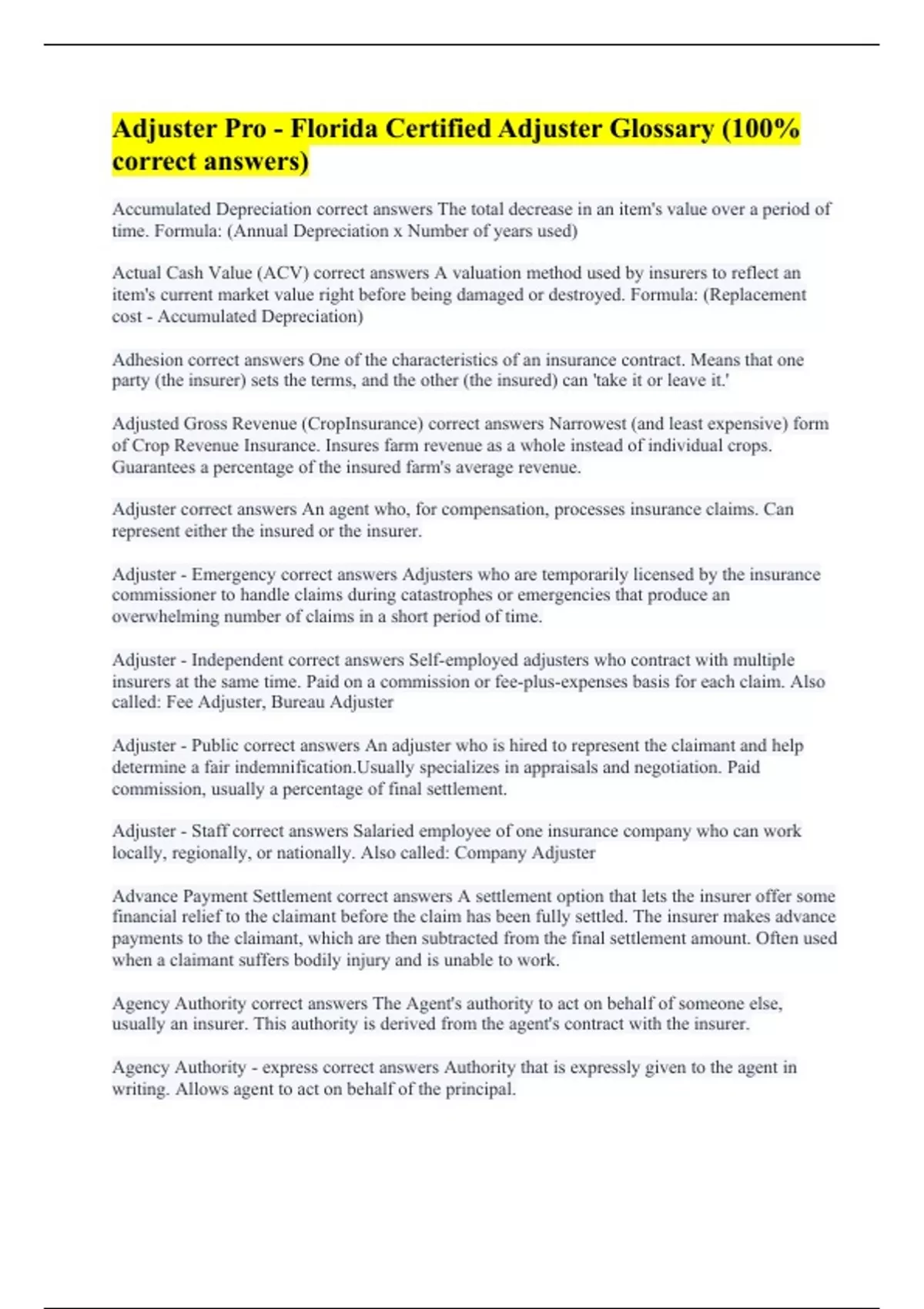 Adjuster Pro - Florida Certified Adjuster Glossary (100% correct answers)