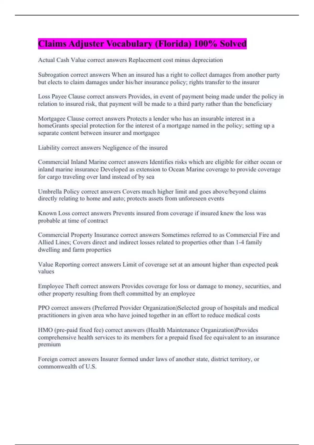 Claims Adjuster Vocabulary (Florida) 100% Solved