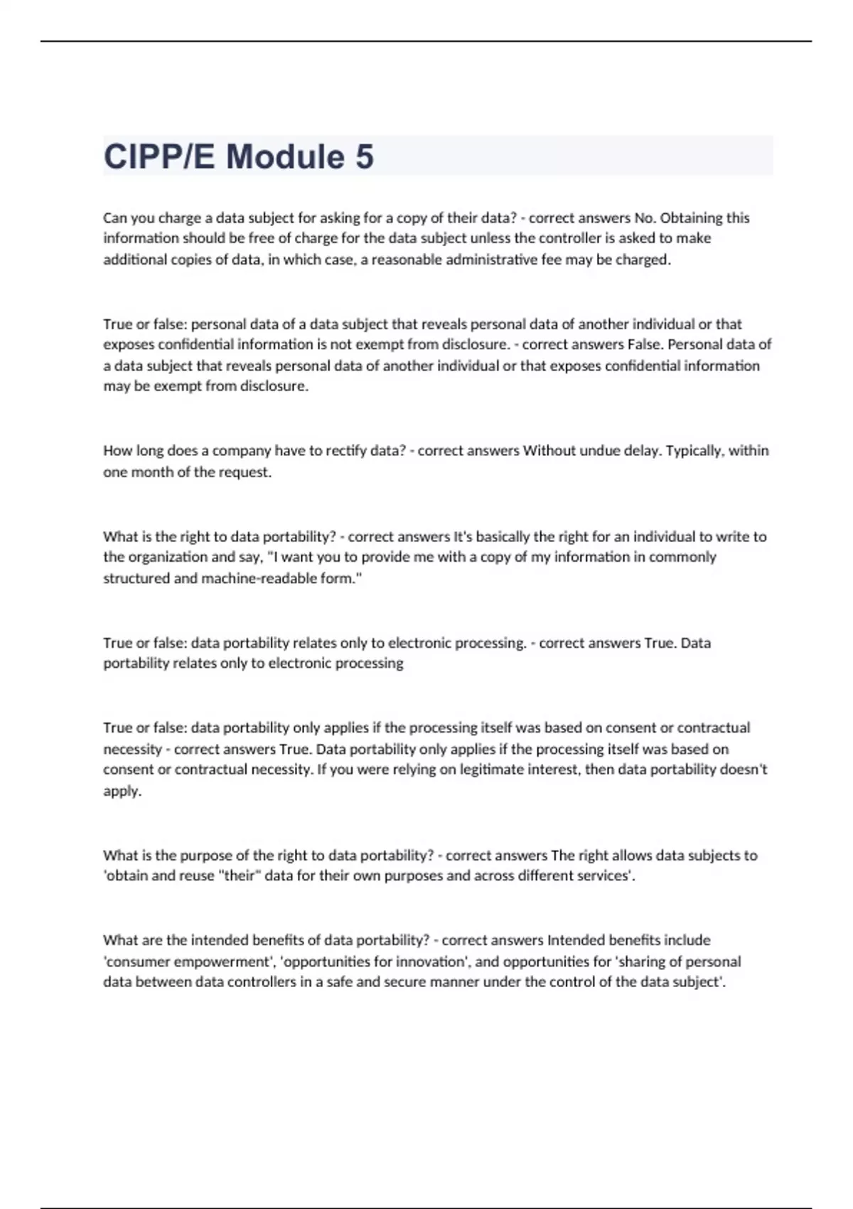 CIPPE Module 5 Question and answers 2023/2024 verified to passCan you charge a data subject for asking for a copy of their data? - correct answers No. Obtaining this information should be free of charge for the data subject unless the controller is asked to make additional copies of data, in which case, a reasonable administrative fee may be charged. True or false: personal data of a data subject that reveals personal data of another individual or that exposes confidential information is not exempt from disclosure. - correct answers False. Personal data of a data subject that reveals personal data of another individual or that exposes confidential information may be exempt from disclosure. How long does a company have to rectify data? - correct answers Without undue delay. Typically, within one month of the request. What is the right to data portability? - correct answers It's basically the right for an individual to write to the organization and say, "I want you to provide me with a copy of my information in commonly structured and machine-readable form." True or false: data portability relates only to electronic processing. - correct answers True. Data portability relates only to electronic processing True or false: data por