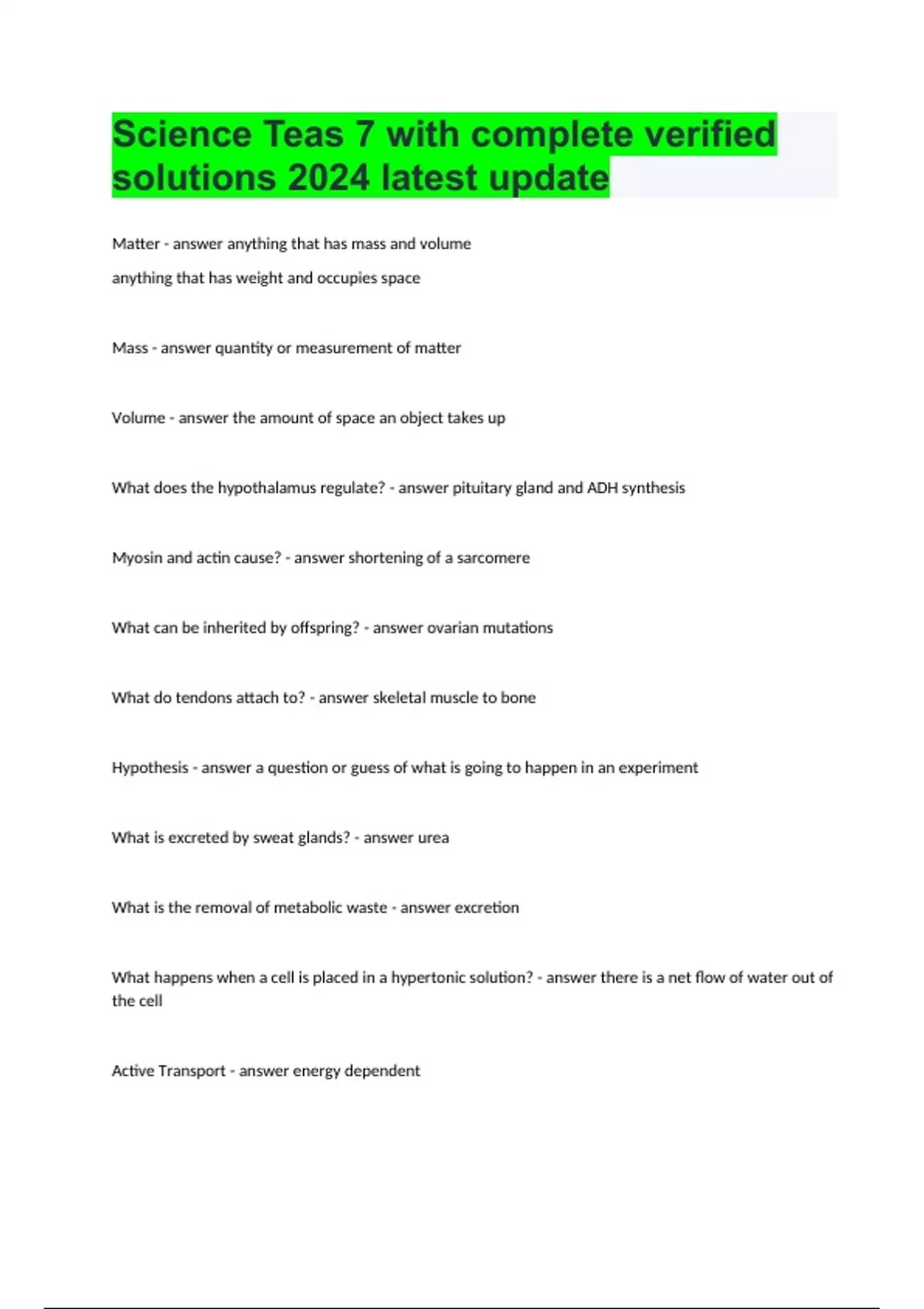 Matter anything that has mass and volume anything that has weight and occupies space Mass quantity or measurement of matter Brainpower Read More Previous Play Next Rewind 10 seconds Move forward 10 seconds Unmute 0:01 / 0:15 Full screen Volume the amount of space an object takes up What does the hypothalamus regulate? pituitary gland and ADH synthesis Myosin and actin cause? shortening of a sarcomere What can be inherited by offspring? ovarian mutations What do tendons attach to? skeletal muscle to bone Hypothesis a question or guess of what is going to happen in an experiment What is excreted by sweat glands? urea What is the removal of metabolic waste excretion What happens when a cell is placed in a hypertonic solution? there is a net flow of water out of the cell Active Transport energy dependent Passive Transport (Diffusion) ATP What is the function of the superior vena cava? carries blood from upper body to the right atrium What are carbohydrates made of? monosaccharides Active immunity Adaptive Immunity What is the weakness of a correlation study? can not determine causation What does a vasectomy block do? blocks movement of speed from the testis to epidymis The isotope c12 has 6 neutrons and 6 protons What damage in the spine causes paralysis? nervous tissue What system has the same origin tissue has the lungs? gastrointestinal What does water dissolve? polar ionic compounds Amylase digest starches into disaccharides Histones (protein) are associated with DNA Water has a concave meniscus from the particles of the liquid and the container (adhesion) is more than half the attraction of the particles of the liquid to each other (cohesion) adhesion more than cohesion What happens when a foxes fur turns different colors in winter? phenotype changes but genotype does not Function of catalyst increase of rate of reaction Sublimation solid to gas What happens during inhalation? diaphragm moves downward ventral cavity is subdivided into two cavities dermis contains glands and hair follicles in a prokaryotic and eukaryotic cell cell membrane is present Koch's postulates are caused by microorganism What is part of the pulmonary circuit? pulmonary vein What determines a person's dna sequence? genes What acts as a buffer? carbonic acid When liquid turns into gas particles become less ordered Testosterone is a androgen Two major parts of the nervous system brain and spinal cord