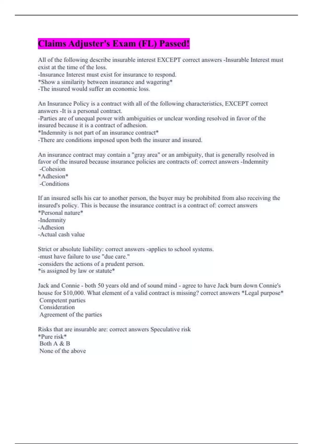 All of the following describe insurable interest EXCEPT correct answers -Insurable Interest must exist at the time of the loss. -Insurance Interest must exist for insurance to respond. *Show a similarity between insurance and wagering* -The insured would suffer an economic loss. An Insurance Policy is a contract with all of the following characteristics, EXCEPT correct answers -It is a personal contract. -Parties are of unequal power with ambiguities or unclear wording resolved in favor of the insured because it is a contract of adhesion. *Indemnity is not part of an insurance contract* -There are conditions imposed upon both the insurer and insured. An insurance contract may contain a "gray area" or an ambiguity, that is generally resolved in favor of the insured because insurance policies are contracts of: correct answers -Indemnity -Cohesion *Adhesion* -Conditions If an insured sells his car to another person, the buyer may be prohibited from also receiving the insured's policy. This is because the insurance contract is a contract of: correct answers *Personal nature* -Indemnity -Adhesion -Actual cash value Strict or absolute liability: correct answers -applies to school systems. -must have failure to use "due care." -considers the actions of a prudent person. *is assigned by law or statute* Jack and Connie - both 50 years old and of sound mind - agree to have Jack burn down Connie's house for $10,000. What element of a valid contract is missing? correct answers *Legal purpose* Competent parties Consideration Agreement of the parties Risks that are insurable are: correct answers Speculative risk *Pure risk* Both A & B None of the above
