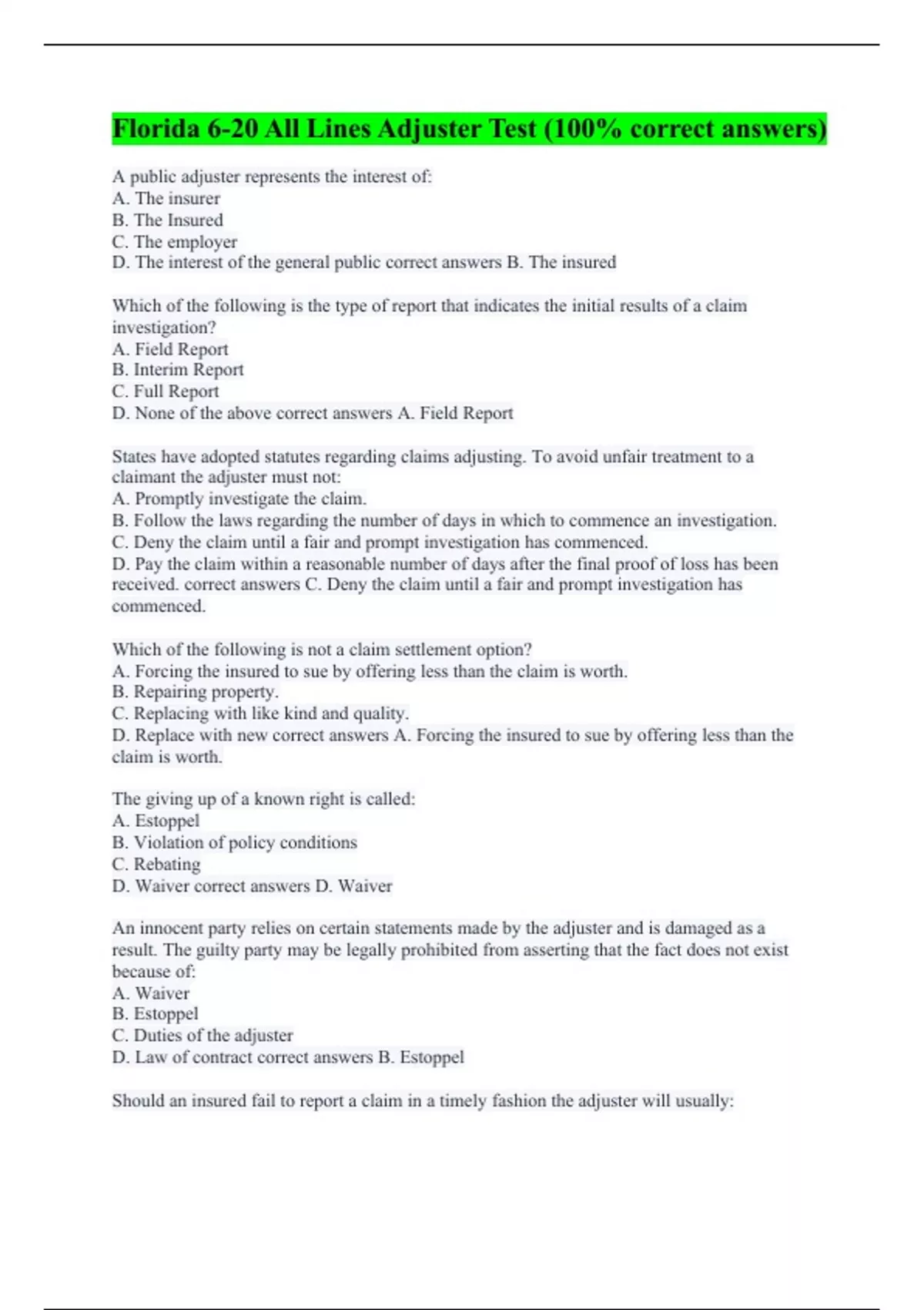 A public adjuster represents the interest of: A. The insurer B. The Insured C. The employer D. The interest of the general public correct answers B. The insured Which of the following is the type of report that indicates the initial results of a claim investigation? A. Field Report B. Interim Report C. Full Report D. None of the above correct answers A. Field Report States have adopted statutes regarding claims adjusting. To avoid unfair treatment to a claimant the adjuster must not: A. Promptly investigate the claim. B. Follow the laws regarding the number of days in which to commence an investigation. C. Deny the claim until a fair and prompt investigation has commenced. D. Pay the claim within a reasonable number of days after the final proof of loss has been received. correct answers C. Deny the claim until a fair and prompt investigation has commenced. Which of the following is not a claim settlement option? A. Forcing the insured to sue by offering less than the claim is worth. B. Repairing property. C. Replacing with like kind and quality. D. Replace with new correct answers A. Forcing the insured to sue by offering less than the claim is worth. The giving up of a known right is called: A. Estoppel B. Violation of policy conditions C. Rebating D. Waiver correct answers D. Waiver An innocent party relies on certain statements made by the adjuster and is damaged as a result. The guilty party may be legally prohibited from asserting that the fact does not exist because of: A. Waiver B. Estoppel C. Duties of the adjuster D. Law of contract correct answers B. Estoppel Should an insured fail to report a claim in a timely fashion the adjuster will usually: