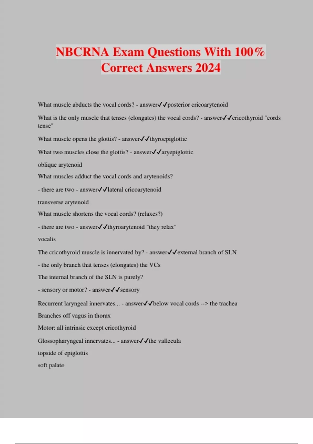 NBCRNA Exam Questions With 100% Correct Answers 2024 What muscle abducts the vocal cords? - answerposterior cricoarytenoid What is the only muscle that tenses (elongates) the vocal cords? - answercricothyroid "cords tense" What muscle opens the glottis? - answerthyroepiglottic What two muscles close the glottis? - answeraryepiglottic oblique arytenoid What muscles adduct the vocal cords and arytenoids? - there are two - answerlateral cricoarytenoid transverse arytenoid What muscle shortens the vocal cords? (relaxes?) - there are two - answerthyroarytenoid "they relax" vocalis The cricothyroid muscle is innervated by? - answerexternal branch of SLN - the only branch that tenses (elongates) the VCs The internal branch of the SLN is purely? - sensory or motor? - answersensory Recurrent laryngeal innervates... - answerbelow vocal cords --> the trachea Branches off vagus in thorax Motor: all intrinsic except cricothyroid Glossopharyngeal innervates... - answerthe vallecula topside of epiglottis soft palate oropharynx post 1/3 of tongue tonsils *afferent limb of gag reflex* CN IX - sensory Superior laryngeal innervates... - answerposterior epiglottis --> vocal cords Internal branch is sensory - underside of epiglottis External branch is motor - cricothyroid muscle Trigeminal (V) V3 innervates... - answeranterior 2/3 tongue Trigeminal nerve (V) contains what 3 branches? - answerV1 ophthalmic (anterior ethmoidal) - nares/ant 1/3 septum V2 maxillary (sphenopalatine) - turbinates/septum V3 Mandibular (lingual) Superior laryngeal nerve block: - answer3ml at the inferior aspect of the greater cornu of hyoid bone bilaterally - helps tolerate FO intubation once past the oropharynx Glossopharyngeal block: - answer1-2 ml at the tonsillar pillar bilaterally Transtracheal block: - answer3-5 ml through the cricothyroid membrane What is most likely to injure the left RLN while sparing the right RLN? - answerMitral stenosis (LA enlargement compresses the nerve and may present as hoarseness) PDA ligation Aortic arch aneurysm Thoracic tumor Causes of left OR right RLN injury: - answerparathyroid or thyroid surgery external pressure from LMA/ETT neck tumor neck extension Where does the right RLN loop? left RLN loop? - answerunder the right subclavian artery - left under the aorta (more susceptible to injury) For the patient in sitting position, order the cartilages from superior to inferior: cricoid epiglottis arytenoid corniculate - answerepiglottis corniculate arytenoid cricoid How many unpaired cartilages present in the larynx? Paired? - answer3 unpaired 3 paired 9 cartilages total Where is the adult larynx located? Infant larynx? - answerC3-C6 Infant is C2-C4 What is the narrowest part of the airway? adult/infant - answerVocal cords for adult Cricoid for infant, if paralyzed = vocal cords Risk factors for intraoperative laryngospasm? - answerGERD Exposure to 2nd hand smoke recent URI Age < 1 year HYPOcapnia light anesthesia saliva or blood in the upper airway What is the definition of laryngospasm? - answerSustained and involuntary contraction of the vocal cord Adductors that result in the inabilit