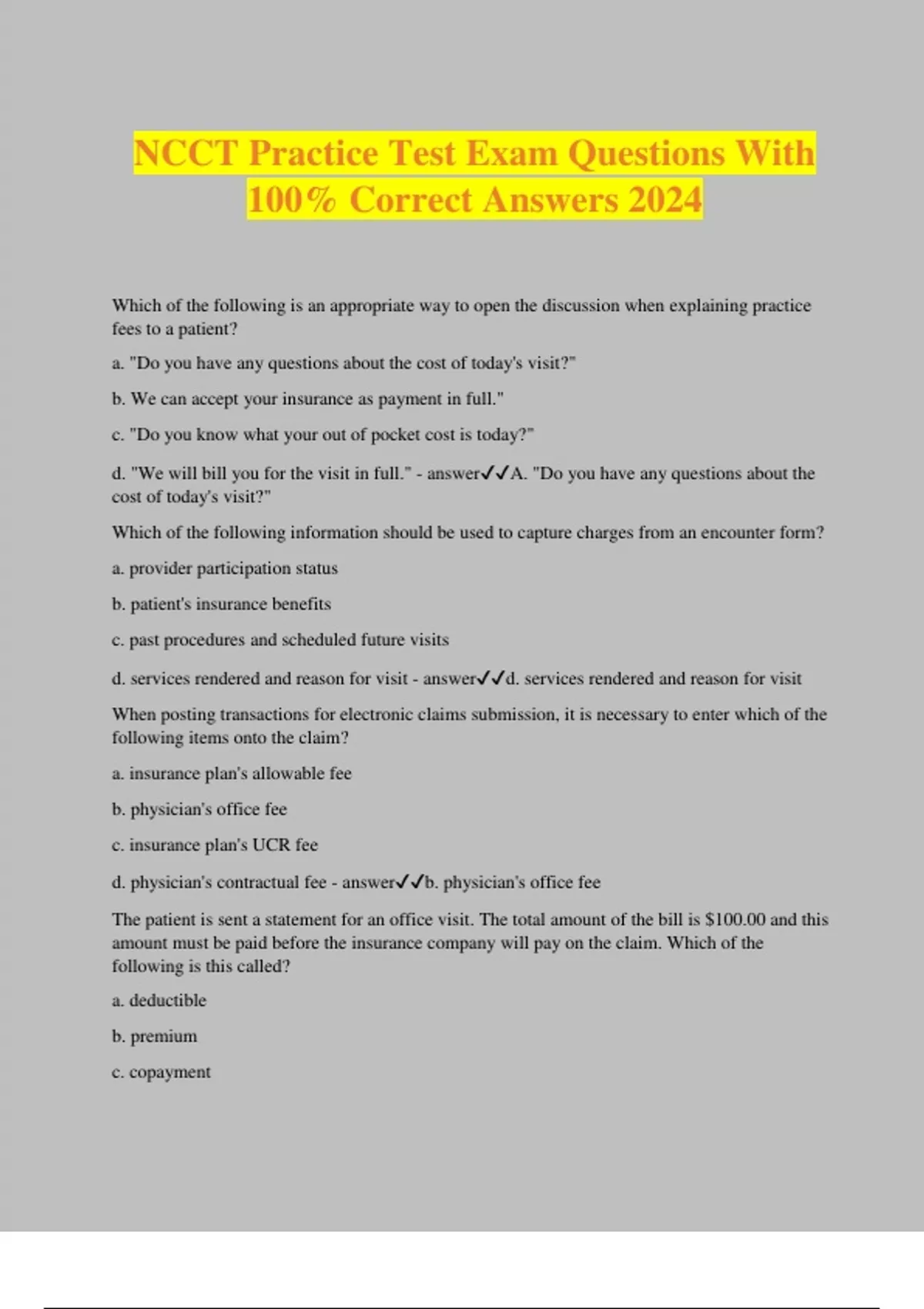 NCCT Practice Test Exam Questions With 100% Correct Answers 2024 Which of the following is an appropriate way to open the discussion when explaining practice fees to a patient? a. "Do you have any questions about the cost of today's visit?" b. We can accept your insurance as payment in full." c. "Do you know what your out of pocket cost is today?" d. "We will bill you for the visit in full." - answerA. "Do you have any questions about the cost of today's visit?" Which of the following information should be used to capture charges from an encounter form? a. provider participation status b. patient's insurance benefits c. past procedures and scheduled future visits d. services rendered and reason for visit - answerd. services rendered and reason for visit When posting transactions for electronic claims submission, it is necessary to enter which of the following items onto the claim? a. insurance plan's allowable fee b. physician's office fee c. insurance plan's UCR fee d. physician's contractual fee - answerb. physician's office fee The patient is sent a statement for an office visit. The total amount of the bill is $100.00 and this amount must be paid before the insurance company will pay on the claim. Which of the following is this called? a. deductible b. premium c. copayment d. coinsurance - answera. deductible When posting an insurance payment via an EOB, the amount that is considered contractual is the: a. co-insurance b. NON-PAR payment allowable c. patient responsibility d. insurance allowed amount - answerd. insurance allowed amount Developing an insurance claim begins a. when the patient calls to schedule an appointment b. once the charges have been entered into the computer c. when the patient arrives for the appointment d. after the medical encounter is completed - answera. when the patient calls to schedule an appointment When should a provider have a patient sign an ABN? a. when a service is excluded from coverage under Medicare b. when the items may be denied and prior to performing the service c. when the service is covered under Part B fee schedule d. prior to treating a patient who requires emergency services that might not be covered - answerb. when the items may be denied and prior to performing the service Which of the following regulations prohibits the submission of a fraudulent claim or making a false statement or representation in connection with a claim? a. Stark Law b. Federal Claims Collection Act c. Federal False Claims Act d. Anti-kickback Law - answerc. Federal False Claims Act The patient's total charges are $300. Th