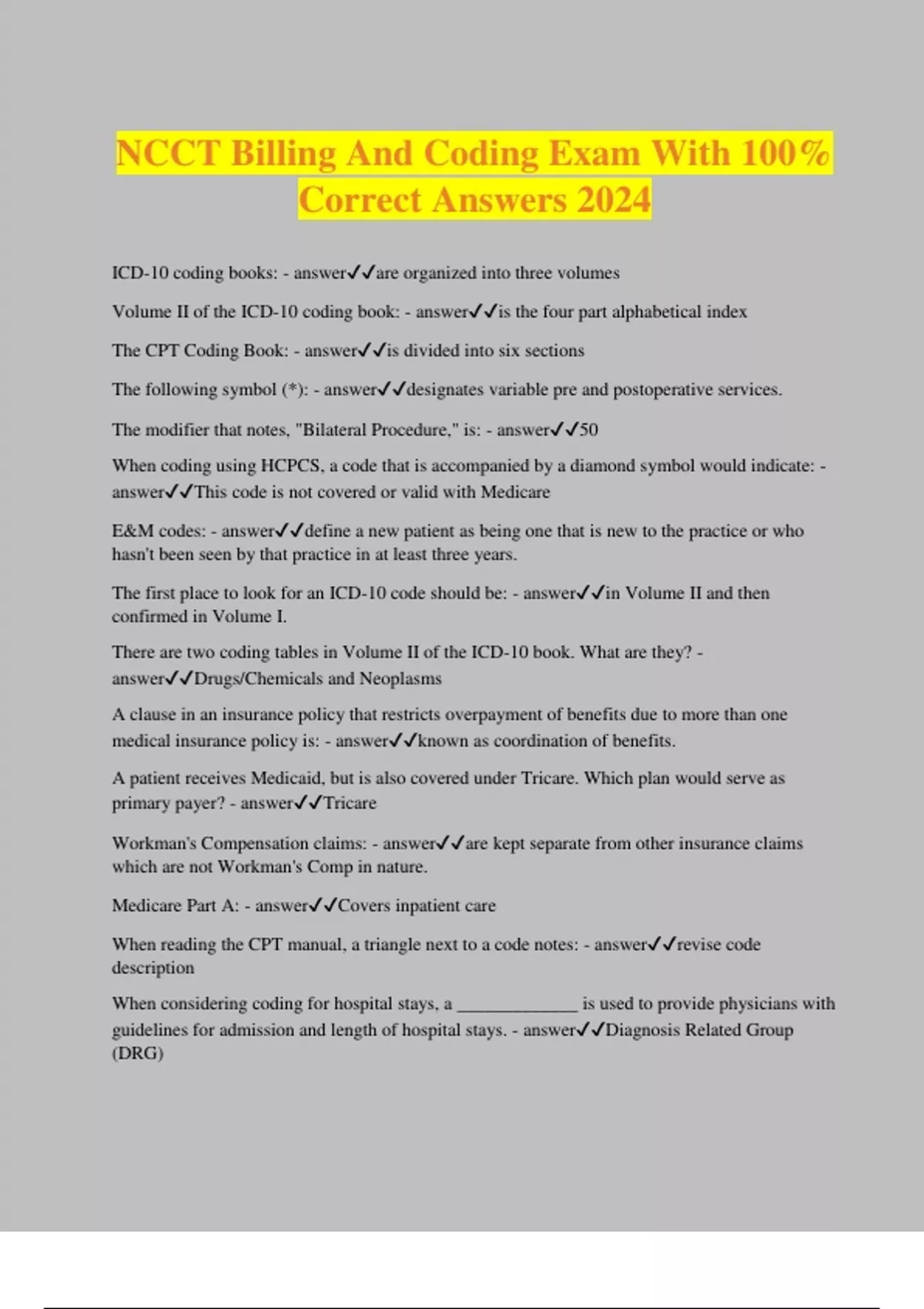 NCCT Billing And Coding Exam With 100% Correct Answers 2024 ICD-10 coding books: - answerare organized into three volumes Volume II of the ICD-10 coding book: - answeris the four part alphabetical index The CPT Coding Book: - answeris divided into six sections The following symbol (*): - answerdesignates variable pre and postoperative services. The modifier that notes, "Bilateral Procedure," is: - answer50 When coding using HCPCS, a code that is accompanied by a diamond symbol would indicate: - answerThis code is not covered or valid with Medicare E&M codes: - answerdefine a new patient as being one that is new to the practice or who hasn't been seen by that practice in at least three years.