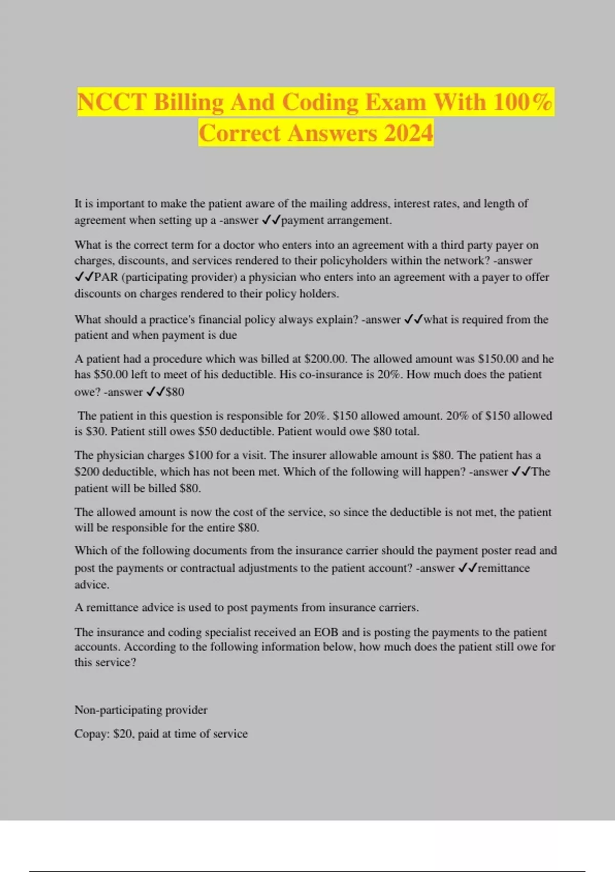 NCCT Billing And Coding Exam With 100% Correct Answers 2024 It is important to make the patient aware of the mailing address, interest rates, and length of agreement when setting up a -answer payment arrangement. What is the correct term for a doctor who enters into an agreement with a third party payer on charges, discounts, and services rendered to their policyholders within the network? -answer PAR (participating provider) a physician who enters into an agreement with a payer to offer discounts on charges rendered to their policy holders. What should a practice's financial policy always explain? -answer what is required from the patient and when payment is due A patient had a procedure which was billed at $200.00. The allowed amount was $150.00 and he has $50.00 left to meet of his deductible. His co-insurance is 20%. How much does the patient owe? -answer $80 The patient in this question is responsible for 20%. $150 allowed amount. 20% of $150 allowed is $30. Patient still owes $50 deductible. Patient would owe $80 total. The physician charges $100 for a visit. The insurer allowable amount is $80. The patient has a $200 deductible, which has not been met. Which of the following will happen? -answer The patient will be billed $80. The allowed amount is now the cost of the service, so since the deductible is not met, the patient will be responsible for the entire $80. Which of the following documents from the insurance carrier should the payment poster read and post the payments or contractual adjustments to the patient account? -answer remittance advice. A remittance advice is used to post payments from insurance carriers. The insurance and coding specialist received an EOB and is posting the payments to the patient accounts. According to the following information below, how much does the patient still owe for this service? Non-participating provider Copay: $20, paid at time of service Deductible amount that patient paid: $100 Accepted fee for service: $250 Insurance payment: $75 -answer $55 Total charges are $250.00 of which the patient has paid $20.00 and $100.00. This now leaves a balance of $130.00, of which the insurance company paid $75.00. This now leaves a balance due from the patient of $55.00. Which of the following are the steps to posting a Medicare payment to the patient's account? - answer Review the EOB., Adjust any contractual agreements., Send the billing statement if there is a balance. First the EOB should be reviewed to make sure all the information is correct and the correct patient is credited. Any payments are posted and all the adjustments are made. Once these tasks are finished, the system will generate a statement of any balances due to send to the patient. There is no need to check the copay since the system will automatically have this information on the statement to the patient. Which of the following does a thorough understanding of the Explanation of Benefits (EOB) supplied by the payer allow the insurance and coding specialist to do? -answer Apply write- offs., Bill patients correctly., Resolve payment issues. Which of the following information will the insurance and coding specialist need to apply the payment correctly when in receipt of an insurance EOB and check for payment? -answer account number, date of service, patient name The difference between the billed amount and the allowed amount for services from a participating provider is -answer adjusted by the provider. When a patient sees a participating provider, he receives a discount. This discounted amount is called the allowed amount. The difference between the billed amount and the allowed amount cannot be charged to the patient when seeing a participating provider. The patient makes a co-payment of $50. To which section of the patient's account should the payment be applied? -answer Credit Which of the following is used to post patient payments in provider offices, electronically or manually? -answer ledgers The ledger keeps track of all payments and outstanding balances for the patients A third party payer sent a report to the hospital explaining the payments of multiple claims submitted for ten patients in the month of November. Which of the following is the title of that document? -answer remittance advi