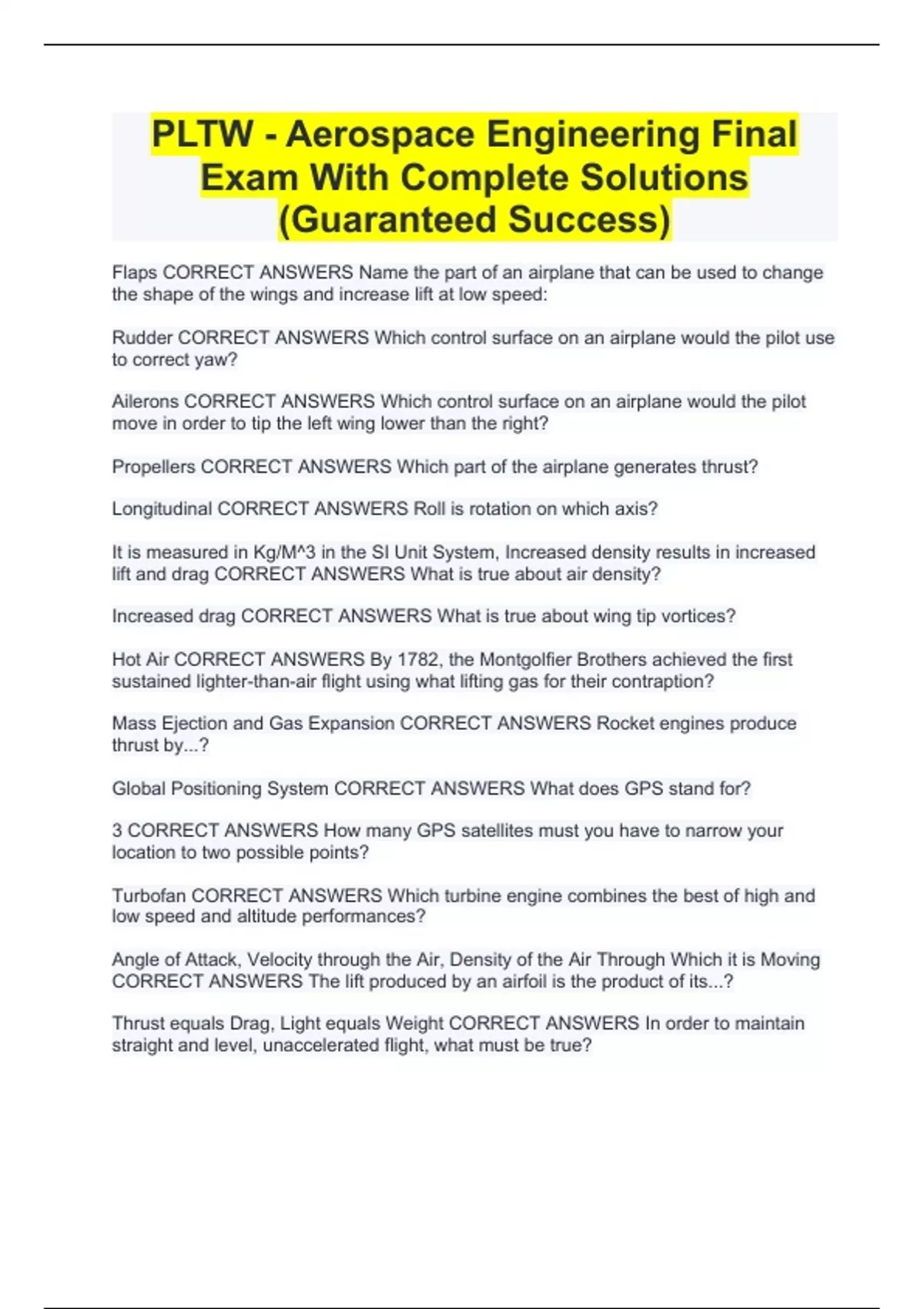 PLTW - Aerospace Engineering Final Exam With Complete Solutions (Guaranteed Success)