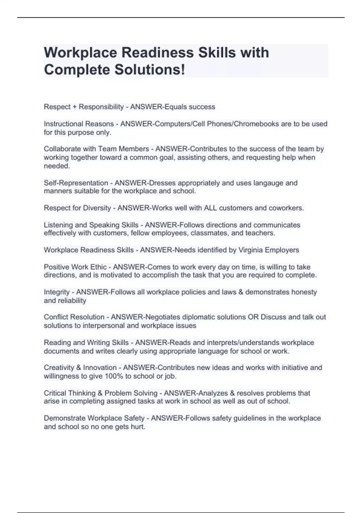 Workplace Readiness Skills with Complete Solutions!