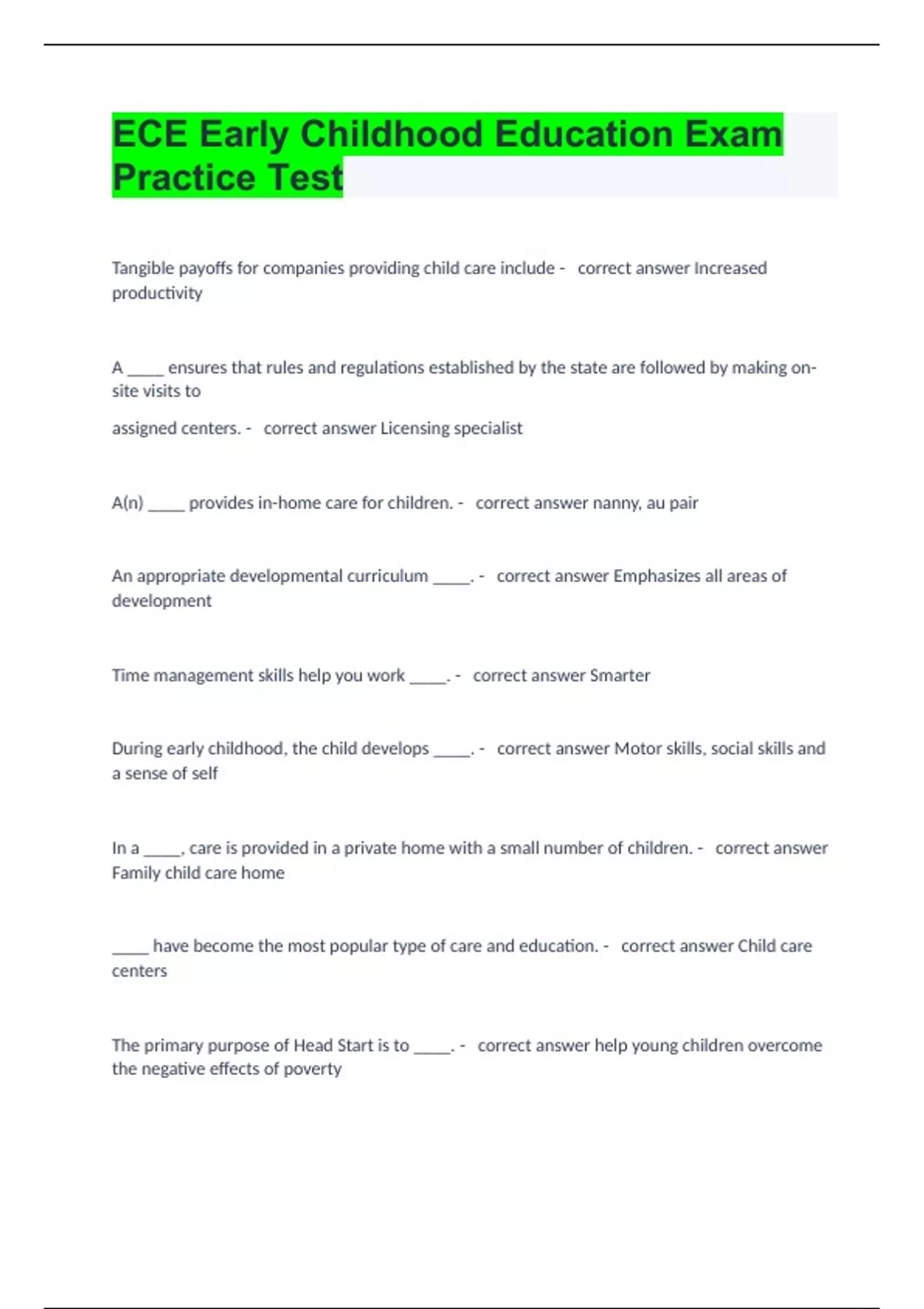 ECE Early Childhood Education Exam Practice Test Tangible payoffs for companies providing child care include - correct answer Increased productivity A ____ ensures that rules and regulations established by the state are followed by making on-site visits to assigned centers. - correct answer Licensing specialist A(n) ____ provides in-home care for children. - correct answer nanny, au pair An appropriate developmental curriculum ____. - correct answer Emphasizes all areas of development Time management skills help you work ____. - correct answer Smarter During early childhood, the child develops ____. - correct answer Motor skills, social skills and