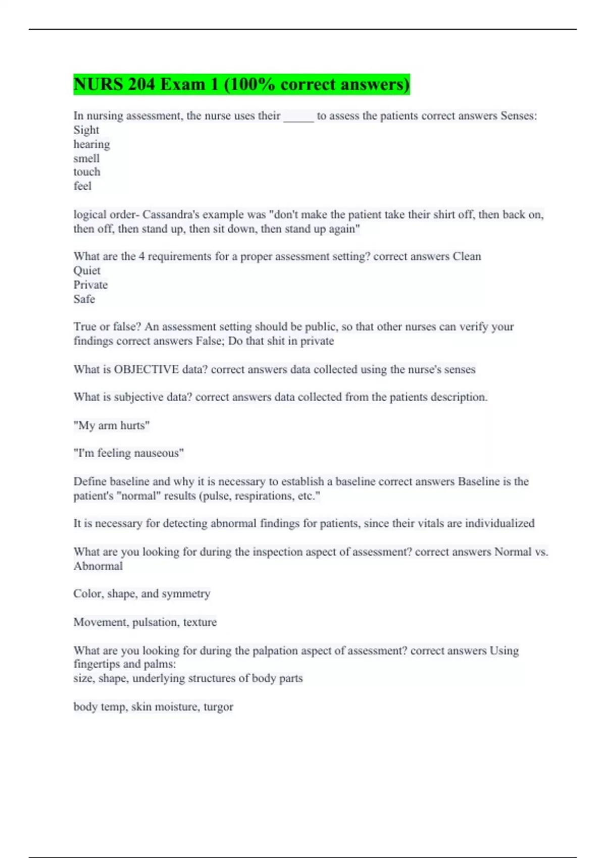 In nursing assessment, the nurse uses their _____ to assess the patients correct answers Senses: Sight hearing smell touch feel logical order- Cassandra's example was "don't make the patient take their shirt off, then back on, then off, then stand up, then sit down, then stand up again" What are the 4 requirements for a proper assessment setting? correct answers Clean Quiet Private Safe True or false? An assessment setting should be public, so that other nurses can verify your findings correct answers False; Do that shit in private What is OBJECTIVE data? correct answers data collected using the nurse's senses What is subjective data? correct answers data collected from the patients description. "My arm hurts" "I'm feeling nauseous" Define baseline and why it is necessary to establish a baseline correct answers Baseline is the patient's "normal" results (pulse, respirations, etc." It is necessary for detecting abnormal findings for patients, since their vitals are individualized What are you looking for during the inspection aspect of assessment? correct answers Normal vs. Abnormal Color, shape, and symmetry Movement, pulsation, texture What are you looking for during the palpation aspect of assessment? correct answers Using fingertips and palms: size, shape, underlying structures of body parts body temp, skin moisture, turgor correct answers Senses: Sight hearing smell touch feel logical order- Cassandra's example was "don't make the patient take their shirt off, then back on, then off, then stand up, then sit down, then stand up again" What are the 4 requirements for a proper assessment setting? correct answers Clean Quiet Private Safe True or false? An assessment setting should be public, so that other nurses can verify your findings correct answers False; Do that shit in private What is OBJECTIVE data? correct answers data collected using the nurse's senses What is subjective data? correct answers data collected from the patients description. "My arm hurts" "I'm feeling nauseous" Define baseline and why it is necessary to establish a baseline correct answers Baseline is the patient's "normal" results (pulse, respirations, etc." It is necessary for detecting abnormal findings for patients, since their vitals are individualized What are you looking for during the inspection aspect of assessment? correct answers Normal vs. Abnormal Color, shape, and symmetry Movement, pulsation, texture What are you looking for during the palpation aspect of assessment? correct answers Using fingertips and palms: size, shape, underlying structures of body parts body temp, skin moisture, turgor