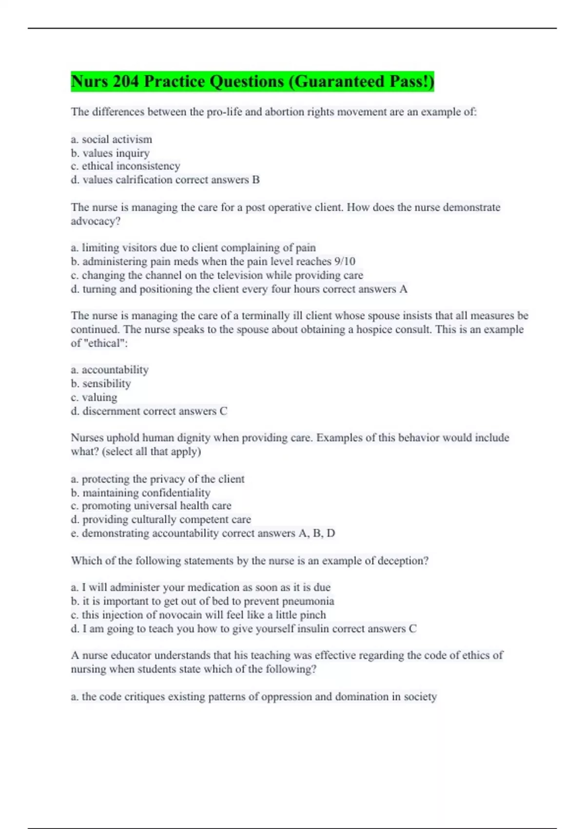 The differences between the pro-life and abortion rights movement are an example of: a. social activism b. values inquiry c. ethical inconsistency d. values calrification correct answers B The nurse is managing the care for a post operative client. How does the nurse demonstrate advocacy? a. limiting visitors due to client complaining of pain b. administering pain meds when the pain level reaches 9/10 c. changing the channel on the television while providing care d. turning and positioning the client every four hours correct answers A The nurse is managing the care of a terminally ill client whose spouse insists that all measures be continued. The nurse speaks to the spouse about obtaining a hospice consult. This is an example of "ethical": a. accountability b. sensibility c. valuing d. discernment correct answers C Nurses uphold human dignity when providing care. Examples of this behavior would include what? (select all that apply) a. protecting the privacy of the client b. maintaining confidentiality c. promoting universal health care d. providing culturally competent care e. demonstrating accountability correct answers A, B, D Which of the following statements by the nurse is an example of deception? a. I will administer your medication as soon as it is due b. it is important to get out of bed to prevent pneumonia c. this injection of novocain will feel like a little pinch d. I am going to teach you how to give yourself insulin correct answers C A nurse educator understands that his teaching was effective regarding the code of ethics of nursing when students state which of the following? a. the code critiques existing patterns of oppression and domination in society