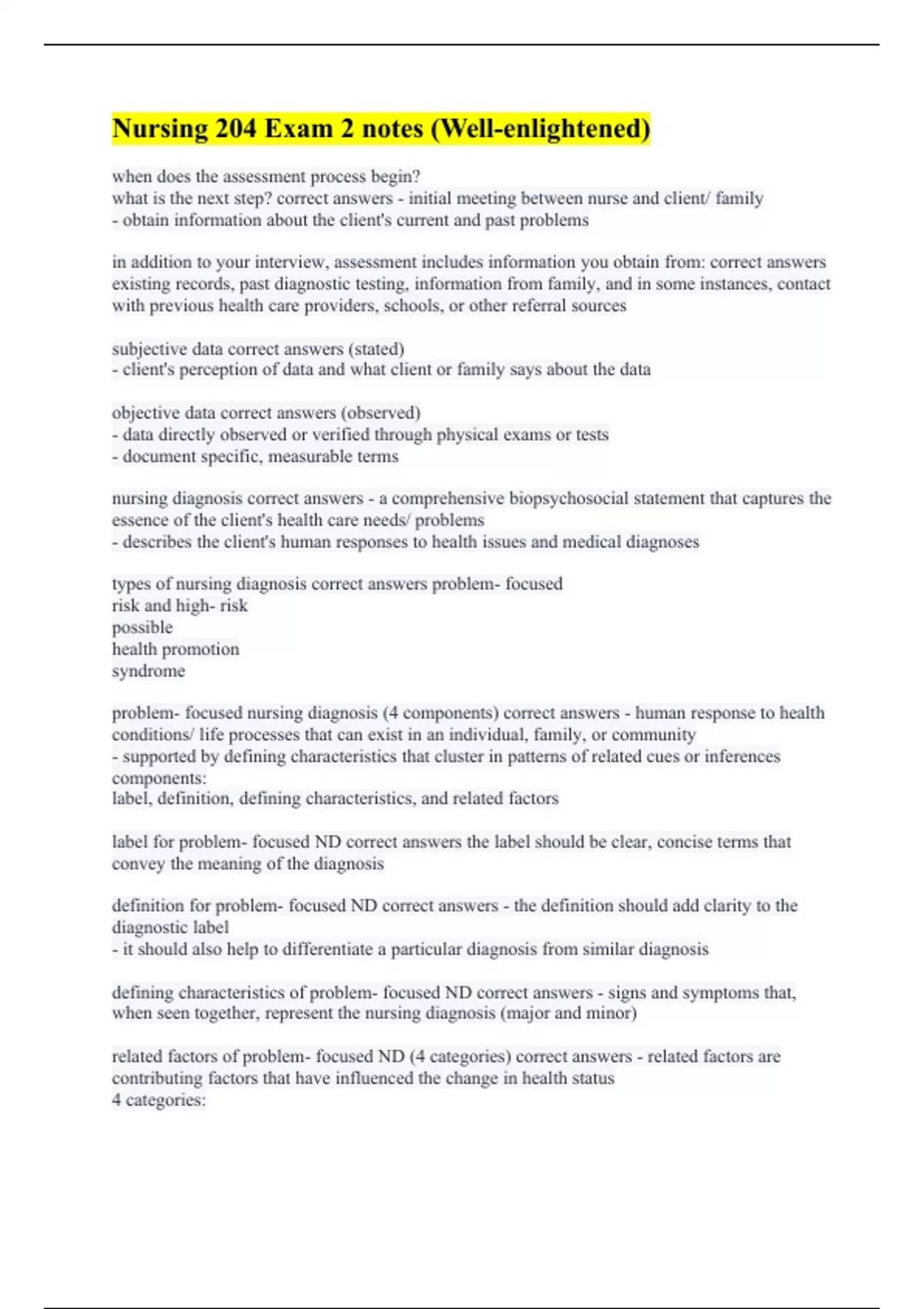 when does the assessment process begin? what is the next step? correct answers - initial meeting between nurse and client/ family - obtain information about the client's current and past problems in addition to your interview, assessment includes information you obtain from: correct answers existing records, past diagnostic testing, information from family, and in some instances, contact with previous health care providers, schools, or other referral sources subjective data correct answers (stated) - client's perception of data and what client or family says about the data objective data correct answers (observed) - data directly observed or verified through physical exams or tests - document specific, measurable terms nursing diagnosis correct answers - a comprehensive biopsychosocial statement that captures the essence of the client's health care needs/ problems - describes the client's human responses to health issues and medical diagnoses types of nursing diagnosis correct answers problem- focused risk and high- risk possible health promotion syndrome problem- focused nursing diagnosis (4 components) correct answers - human response to health conditions/ life processes that can exist in an individual, family, or community - supported by defining characteristics that cluster in patterns of related cues or inferences components: label, definition, defining characteristics, and related factors label for problem- focused ND correct answers the label should be clear, concise terms that convey the meaning of the diagnosis definition for problem- focused ND correct answers - the definition should add clarity to the diagnostic label - it should also help to differentiate a particular diagnosis from similar diagnosis defining characteristics of problem- focused ND correct answers - signs and symptoms that, when seen together, represent the nursing diagnosis (major and minor) related factors of problem- focused ND (4 categories) correct answers - related factors are contributing factors that have influenced the change in health status 4 categories: