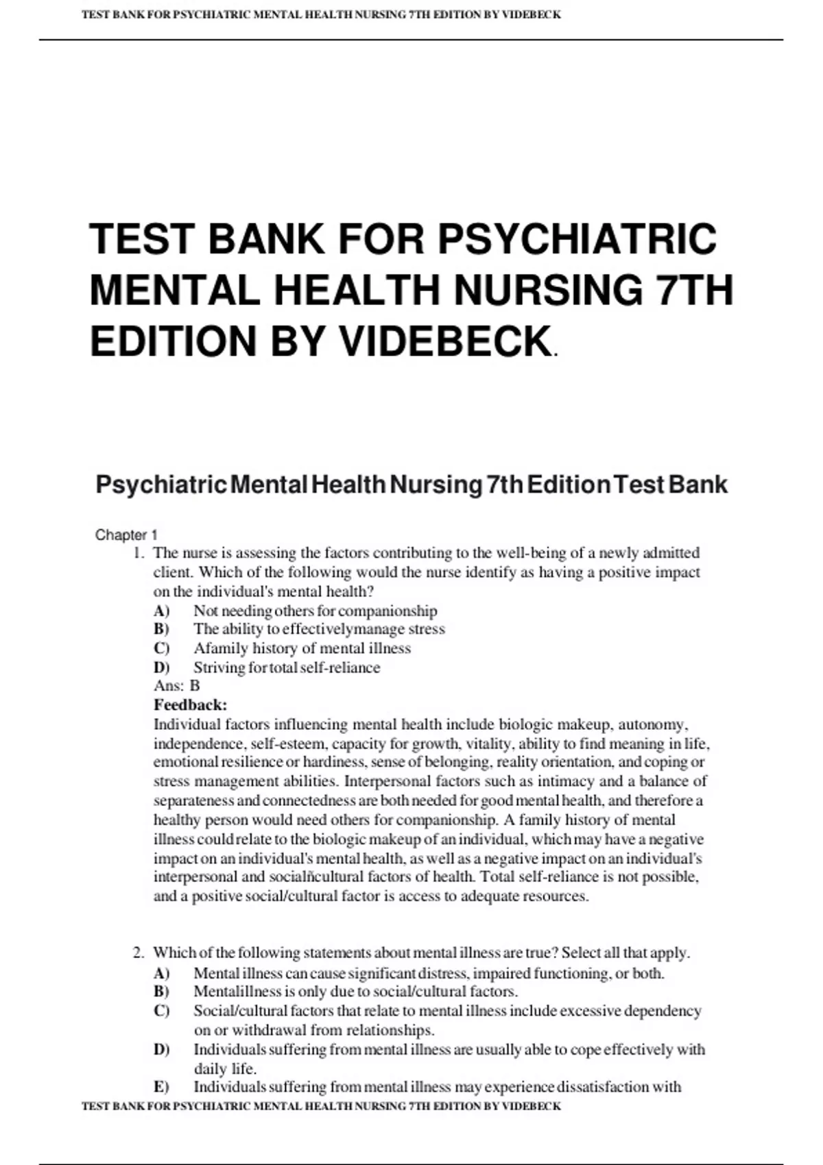 Test bank psychiatric mental health nursing 7th edition videbeck Complete