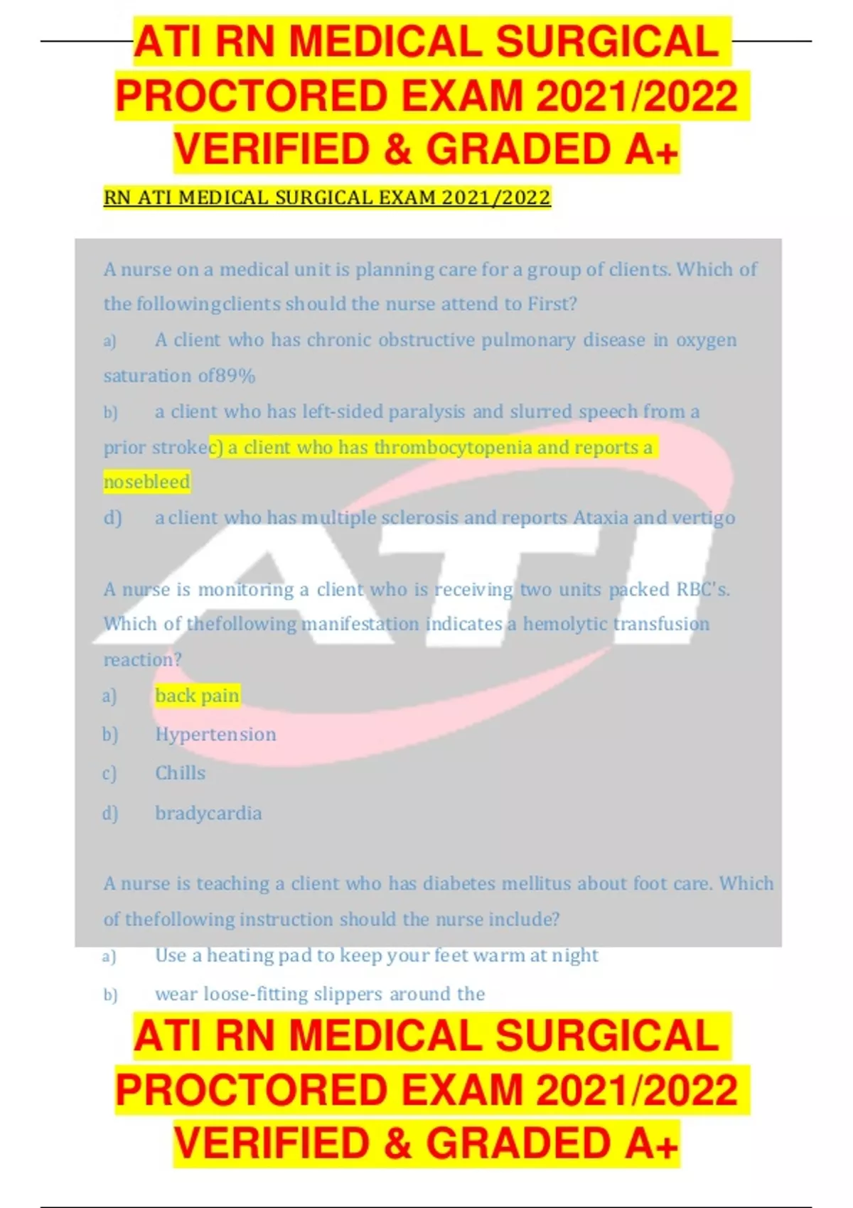 ATI RN MEDICAL SURGICAL PROCTORED EXAM 2021/2022 VERIFIED & GRADED A+ ATI RN MEDICAL SURGICAL PROCTORED EXAM 2021/2022 VERIFIED & GRADED A+ RN ATI MEDICAL SURGICAL EXAM 2021/2022 A nurse on a medical unit is planning care for a group of clients. Which of the followingclients should the nurse attend to First? a) A client who has chronic obstructive pulmonary disease in oxygen saturation of89% b) a client who has left-sided paralysis and slurred speech from a prior strokec) a client who has thrombocytopenia and reports a nosebleed d) a client who has multiple sclerosis and reports Ataxia and vertigo A nurse is monitoring a client who is receiving two units packed RBC's. Which of thefollowing manifestation indicates a hemolytic transfusion reaction? a) back pain b) Hypertension c) Chills d) bradycardia A nurse is teaching a client who has diabetes mellitus about foot care. Which of thefollowing instruction should the nurse include? a) Use a heating pad to keep your feet warm at night b) wear loose-fitting slippers around the